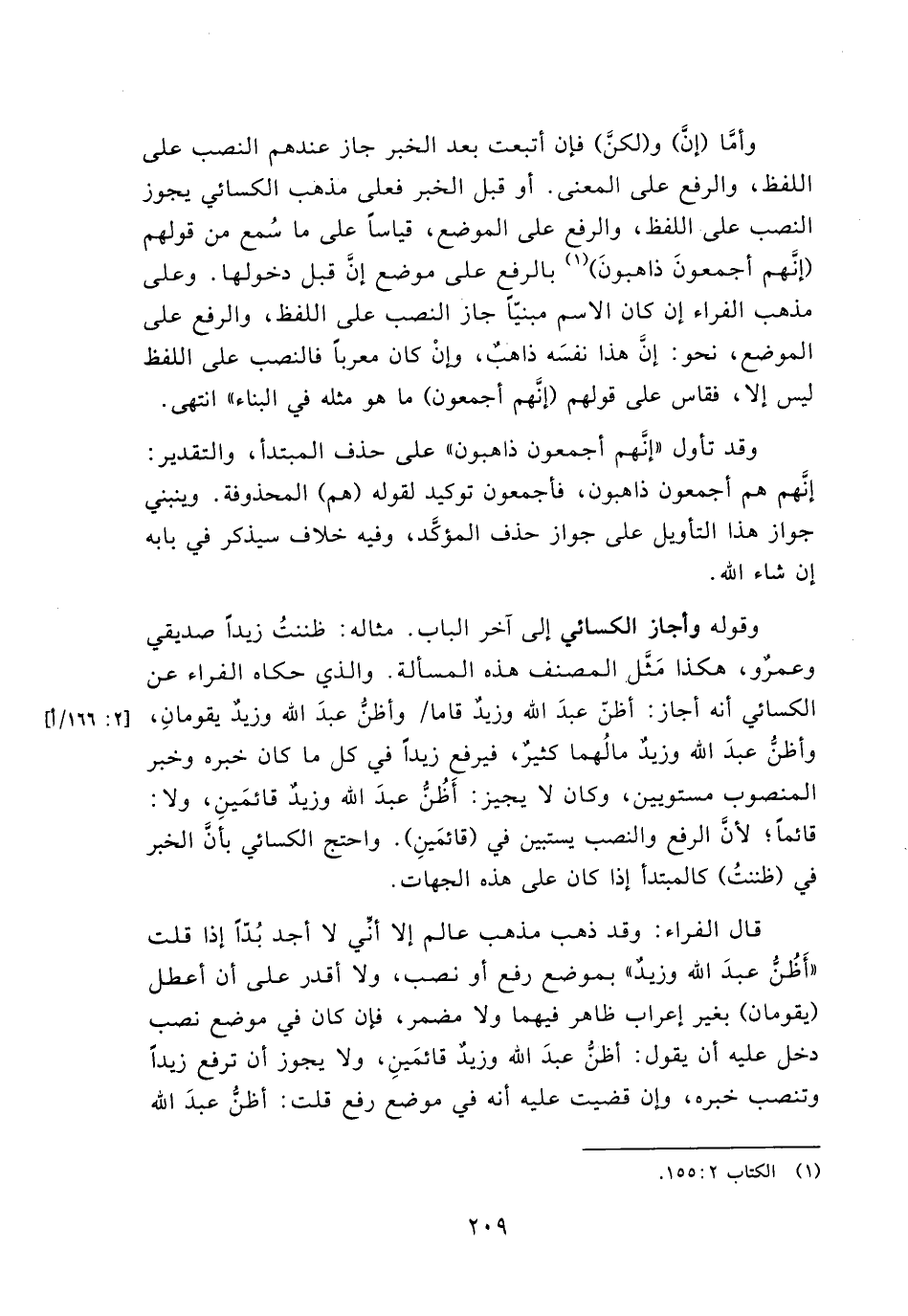 قال الفراء: وقد ذهب مذهب عالم إلا أني لا أجد بدا إذا قلا "أظن عبد الله وزيد" بموضع رفع أو نصب، ولا أقدر على أن أعطل (يقومان) بغير إعراب ظاهر فيهما ولا مضمر، فإن كان في موضع نصب دخل عليه أن يقول: أظن عبد الله وزيد قائمين، ولا يجوز أن ترفع زيدًا وتنصب خبره، وإن قضيت عليه أنه في موضع رفع قلت: أظن عبد الله