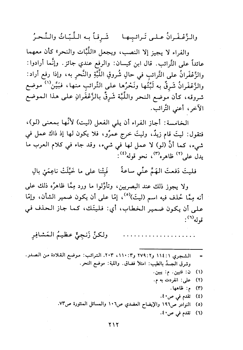 الخامسة: أجاز الفراء أن يلي الفعل (ليت) لأنها بمعنى (لو)، فتقول: ليت زيد، وليت خرج عمرو، فلا يكون لها إذ ذاك عمل في شيء، كما أن (لو) لا عمل لها في شيء، وقد جاء في كلام العرب ما يدل على ظاهرة، نحو قوله: