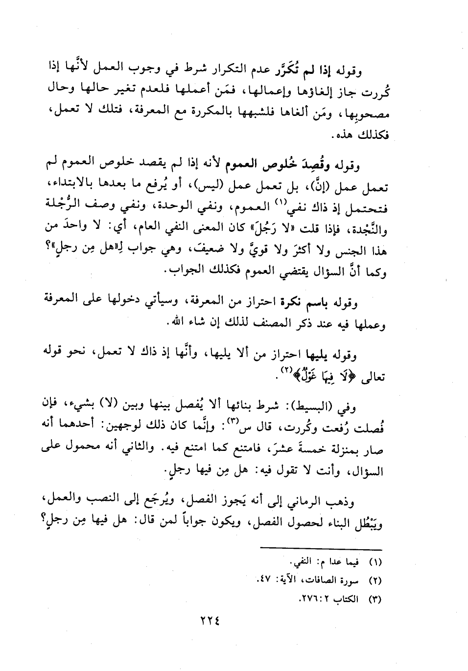 وقوله وقصد خلوص العموم لأنه إذا لم يقصد خلوص العموم لم تعمل عمل (إن)، بل تعمل عمل (ليس)، أو يرفع ما بعدها بالابتداء، فتحتمل إذ ذاك نفي العموم، ونفي الوحدة، ونفي وصف الرجلة والنجدة، فإذا قلت"لا رجل: كان المعني النفي العام، أي: لا واحد من هذا الجنس ولا أكثر ولا قوي ولا ضعيف، وهي جواب لـ"هل من رجل"؟ وكما أن السؤال يقتضي العموم فكذلك الجواب.