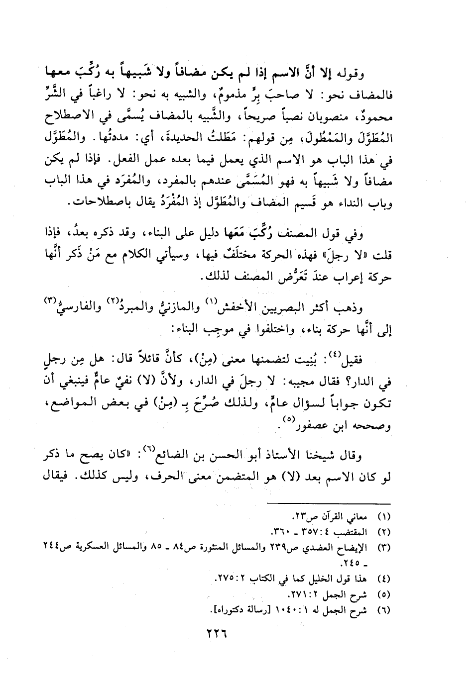 وقوله إلا أن الاسم إذا لم يكن مضافا ولا شبيها به ركب معها فالمضاف نحو: لا صاحب بر مذموم، والشبيه به نحو: لا راغبا في الشر محمود، منصوبان نصبا صريحا، والشبيه بالمضاف يسمى في الاصطلاح المطوَّل والممطول، من قولهم: مطلت الحديدة، أي: مددتها. والمطول في هذا الباب هو الاسم الذي يعمل فيما بعده عمل الفعل. فإذا لم يكن مضافا ولا شبيها به فهو المسمي عندهم بالمفرد، والمفرد في هذا الباب وباب النداء هو قسيم المضاف والمطول إذ المفرد يقال باصطلاحات.
