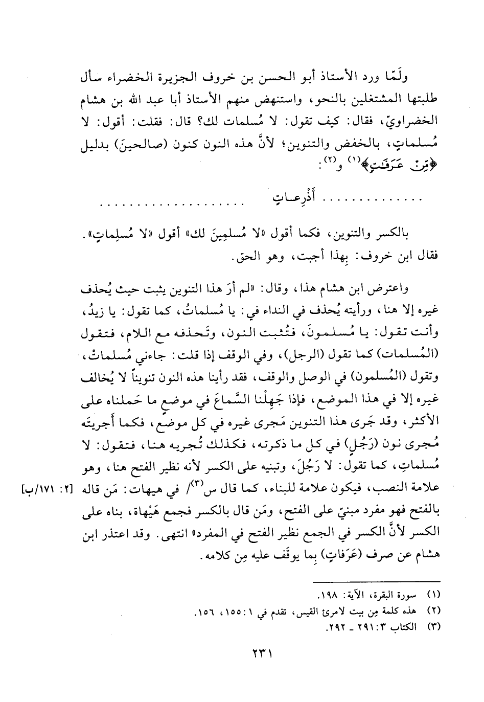 ولما ورد الأستاذ أبو الحسن بن خروف الجزيرة الخضراء سأل طلبتها المشتغلين بالنحو، واستنهض منهم الأستاذ أبا عبد الله بن هشام الخضراوي، فقال: كيف تقول: لا مسلمات لك؟ قال: فقلت: أقول: لا مسلمات، بالخفض والتنوين؛ لأن هذه النون كنون (صالحين) بدليل {مِّنْ عَرَفَاتٍ} و:
