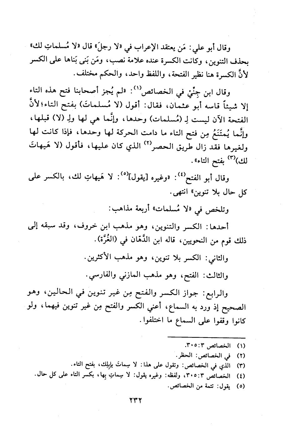وقال ابن جني في الخصائص: "لم يجز أصحابنا فتح هذه التاء إلا شيئًا قاسه أبو عثمان، فقال: أقول (لا مسلمات) بفتح التاء؛ لأن الفتحة الآن ليست لـ (مسلمات) وحدها، وإنما هي لها ولـ (لا) قبلها، وإنما يمتنع من فتح التاء ما دامت الحركة لها وحدها، فإذا كنت لها ولغيرها فقد زال طريق الحصر الذي كان عليها، فأقول (لا هيهات لك) بفتح التاء".