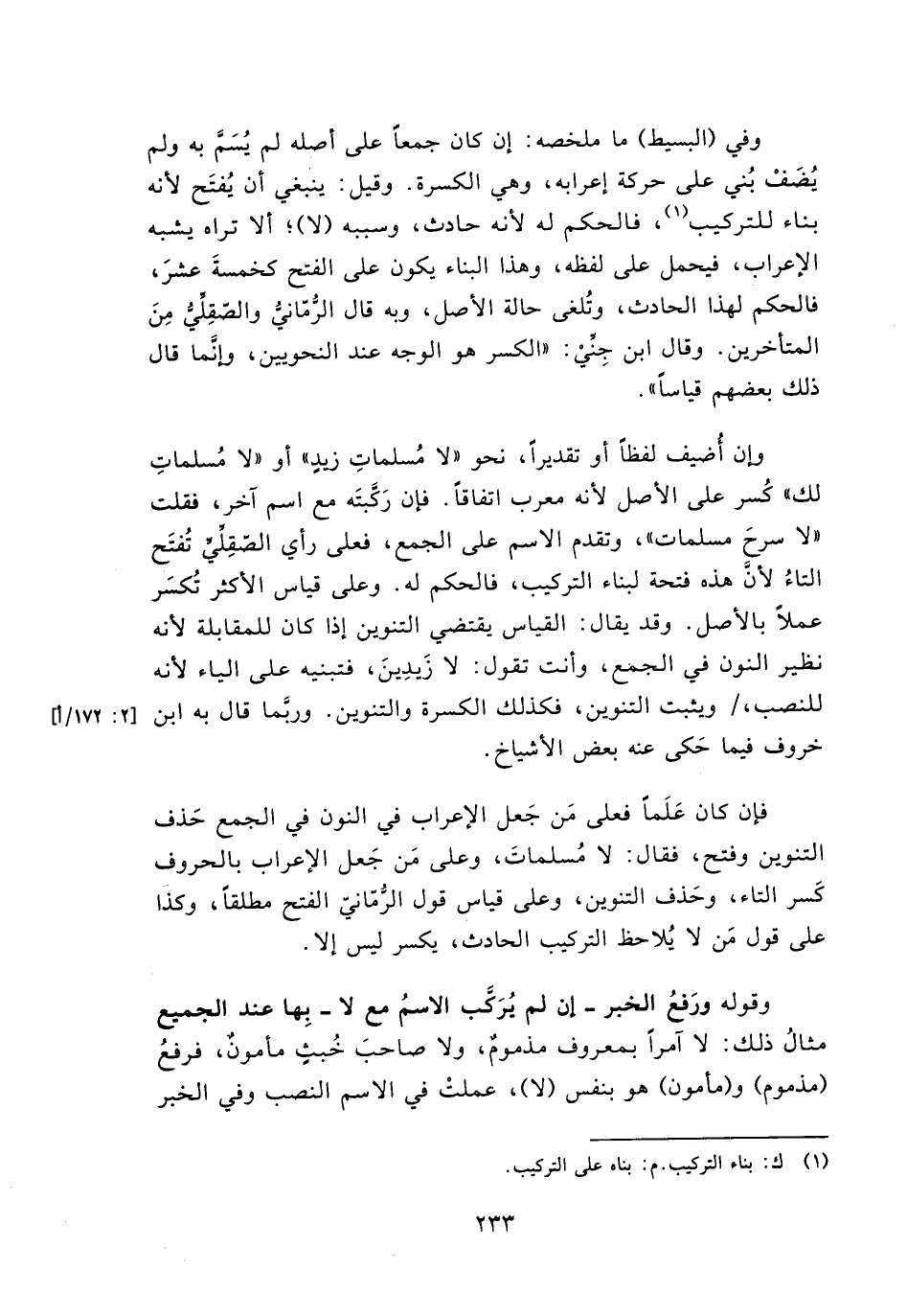 وفي (البسيط) ما ملخصه: إن كان جمعًا على أصله لم يسم به ولم يضف بني على حركة إعرابه، وهي الكسرة. وقيل: ينبغي أن يفتح لأنه بناء للتركيب، فالحكم له لأنه حادث، وسببه (لا)؛ ألا تراه يشبه الإعراب، فيحمل على لفظه، وهذا البناء يكون على الفتح كخمسة عشر، فالحكم لهذا الحادث، وتلغى حالة الأصل، وبع قال الرماني والصقلي من المتأخرين. وقال ابن جني: "الكسر هو الوجه عند النحويين، وإنما قال ذلك بعضهم قياسًا".