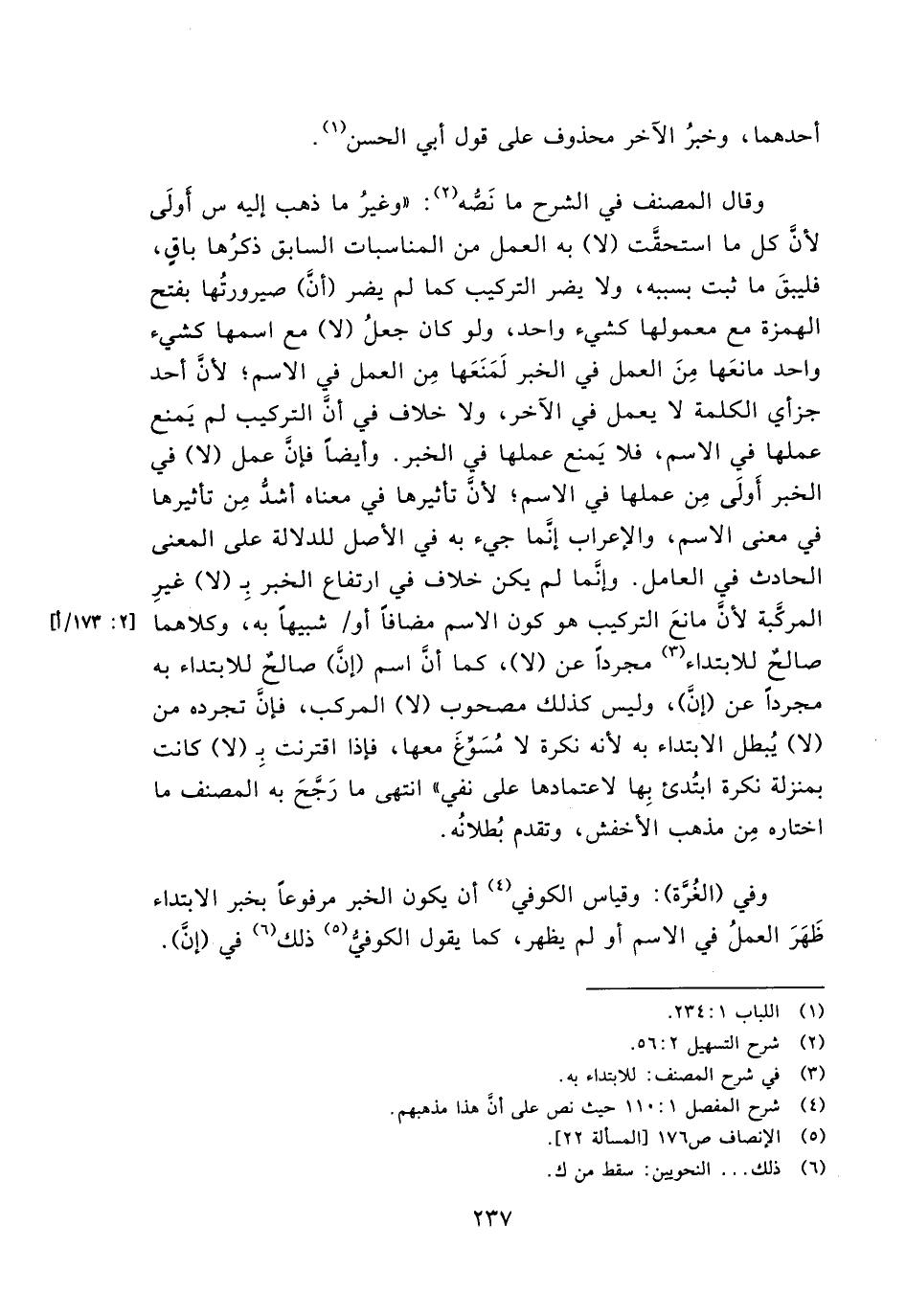 وقال المصنف في الشرح ما نصه: "وغير ما ذهب إليه س أولى لأن كل ما استحقت (لا) به العمل من المناسبات السابق ذكرها باق، فليبق ما ثبت بسببه، ولا يضر التركيب كما لم يضر (أن) صيرورتها بفتح الهمزة مع معمولها كشيء واحد، ولو كان جعل (لا) مع اسمها كشيء واحد مانعها من العمل في الخبر لمنعها من العمل في الاسم؛ لأن أحد جزأي الكلمة لا يعمل في الآخر، ولا خلاف في أن التركيب لم يمنع عملها في الاسم، فلا يمنع عملها في الخبر. وأيضًا فإن عمل (لا) في الخبر أولى من عملها في الاسم؛ لأن تأثيرها في معناه أشد من تأثيرها في معنى الاسم، والإعراب إنما جيء به في الأصل للدلالة على المعنى الحادث في العامل. وإنما لم يكن خلاف في ارتفاع الخبر بـ (لا) غير المركبة لأنه مانع التركيب هو كون الاسم مضافًا أو/ شبيهًا به، وكلاهما صالح للابتداء مجردًا عن (لا)، كما أن اسم (إن) صالح للابتداء به مجردًا عن (إن)، وليس كذلك مصحوب (لا) المركب، فإن تجرده من (لا) يبطل الابتداء به لأنه نكرة لا مسوغ لها، فإذا اقترنت بـ (لا) كانت بمنزلة نكرة ابتدئ بها لاعتمادها على نفي" انتهى ما رجح به المصنف ما اختاره من مذهب الأخفش، وتقدم بطلانه.