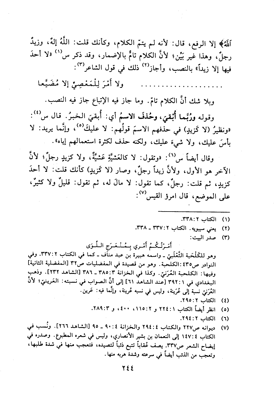 وقال أيضًا س: "وتقول: لا كالعشية عشية، ولا كزيد رجل؛ لأن الآخر هو الأول، ولأن زيدًا رجل، وصار (لا كزيد) كأنك قلت: لا أحد كزيد، ثم قلت: رجل، كما تقول: لا مال له، ثم تقول: قليل ولا كثير، على الموضع، قال امرؤ القيس:
