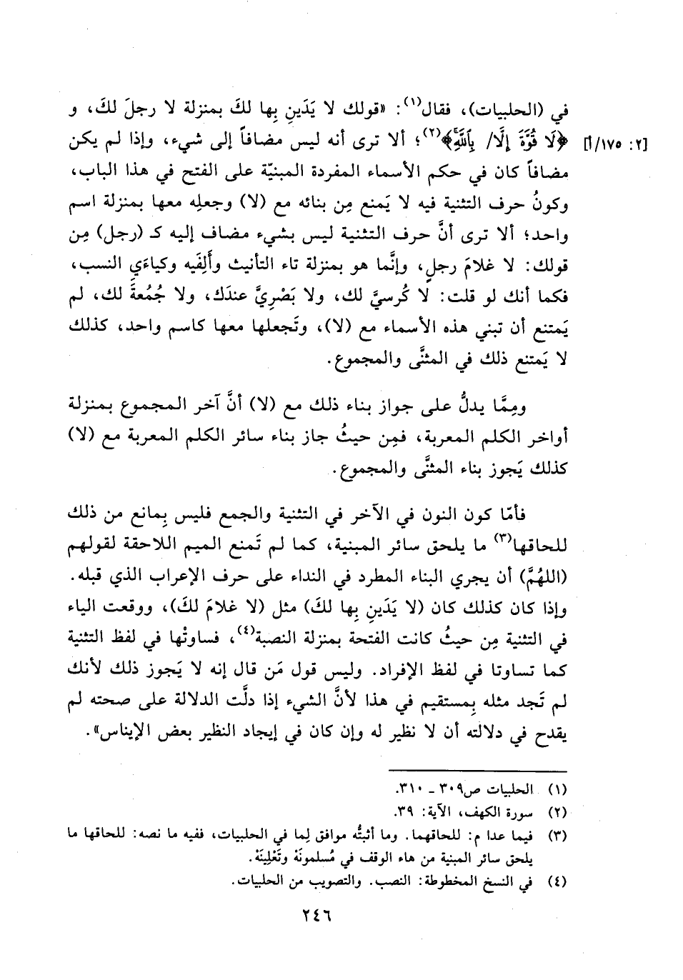 في (الحلبيات)، فقال: "قولك لا يدين بها لك بمنزلة لا رجل لك، و {لا قُوَّةَ إلاَّ/ بِاللَّهِ}؛ ألا ترى أنه ليس مضافًا إلى شيء، وإذا لم يكن مضافًا كان في حكم الأسماء المفردة المبنية على الفتح في هذا الباب، وكون حرف التثنية فيه لا يمنه من بنائه مع (لا) وجعله معها بمنزلة اسم واحد؛ ألا ترى أن حرف التثنية ليس بشيء مضاف إليه كـ (رجل) من قولك: لا غلام رجل، وإنما هو بمنزلة تاء التأنيث وألفيه وكياءي النسب، فكما أنك لو قلت: لا كرسي لك، ولا بصري عندك، ولا جمعة لك، لم يمتنع أن تبنى هذه الأسماء مع (لا)، وتجعلها معها كاسم واحد، كذلك لا يمتنع ذلك في المثنى والجمع.