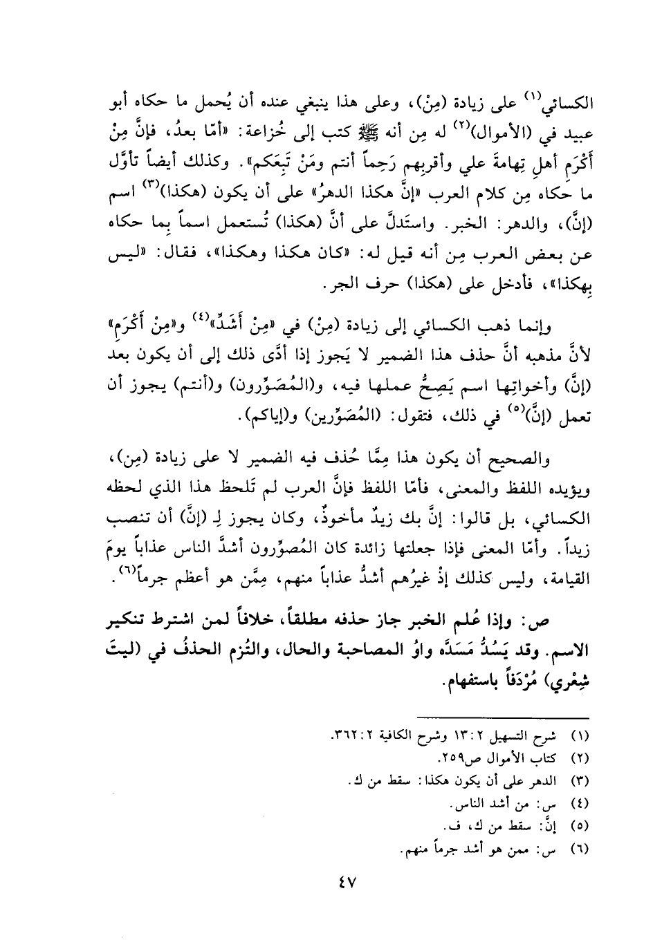 الكسائي على زيادة (من)، وعلى هذا ينبغي عنده أن يحمل ما حكاه أبو عبيد في (الأموال) له من أنه -صلى الله عليه وسلم- كتب إلى خزاعة: "أما بعد، فإن من أكرم أهل تهامة علي وأقربهم رحمًا أنتم ومن تبعكم". وكذلك أيضًا تأول ما حكاه من كلام العرب "إن هكذا الدهر" على أن يكون (هكذا) اسم (إن)، والدهر: الخبر. واستدل على أن (هكذا) تستعمل اسمًا بما حكاه عن بعض العرب من أنه قيل له: "كان هكذا وهكذا"، فقال: "ليس بهكذا"، فأدخل على (هكذا) حرف الجر.