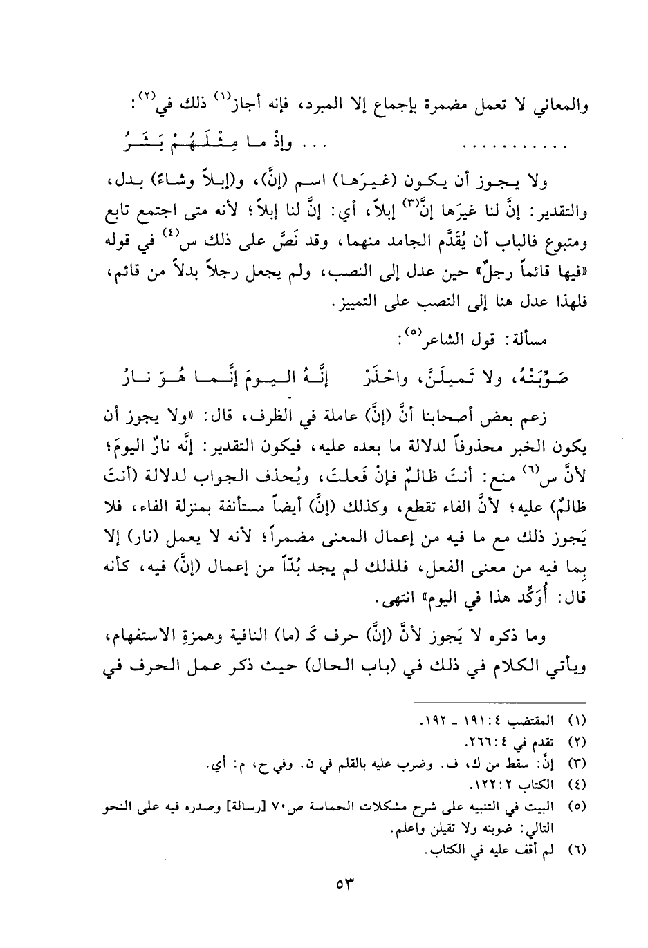 وما ذكره لا يجوز لأن (إن) حرف كـ (ما) النافية وهمزة الاستفهام، ويأتي الكلام في ذلك في (باب الحال) حيث ذكر عمل الحرف في