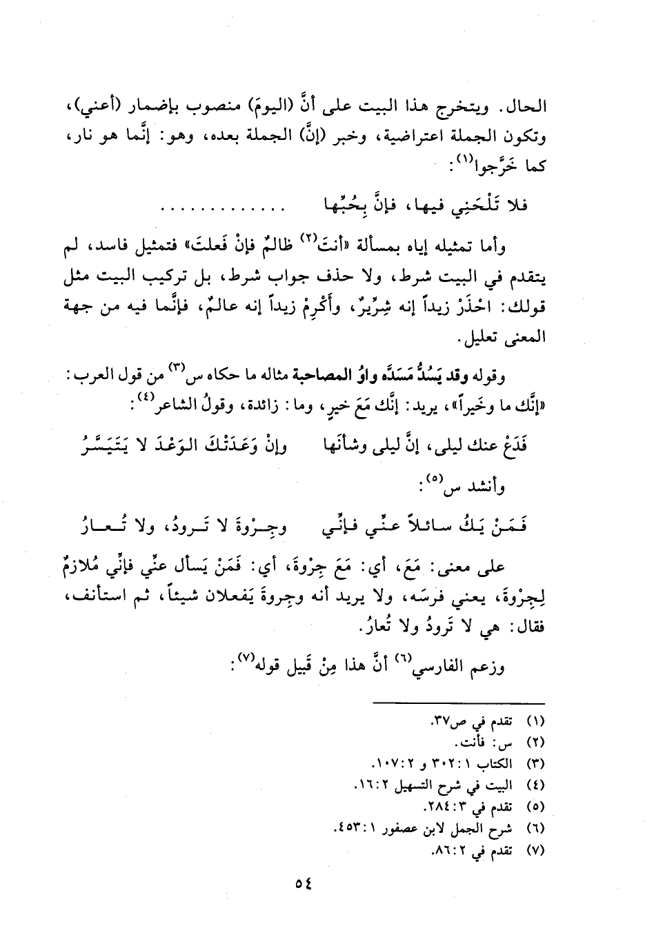 وأما تمثيله إياه بمسألة "أنت ظالم فإن فعلت" فتمثيل فاسد، لم يتقدم في البيت شرط، ولا حذف جواب شرط، بل تركيب البيت مثل قولك: احذر زيدًا إنه شرير، وأكرم زيدًا إنه عالم، فإنما فيه من جهة المعنى تعليل.