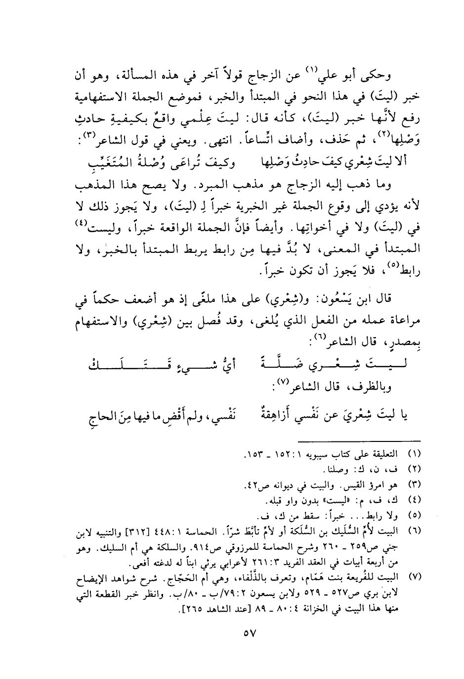 وحكى أبو علي عن الزجاج قولًا آخر في هذه المسألة، وهو أن خبر (ليت) في هذا النحو في المبتدأ والخبر، فموضع الجملة الاستفهامية رفع لأنها خبر (ليت)، كأنه قال: ليت علمي واقع بكيفية حادث وصلها، ثم حذف، وأضاف اتساعًا. انتهى. ويعني في قول الشاعر: