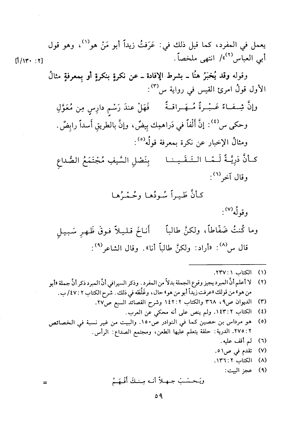 وحكي س: إن ألفًا في دراهمك بيض، وإن بالطريق أسدًا رابض. ومثال الإخبار عن نكرة بمعرفة قوله: