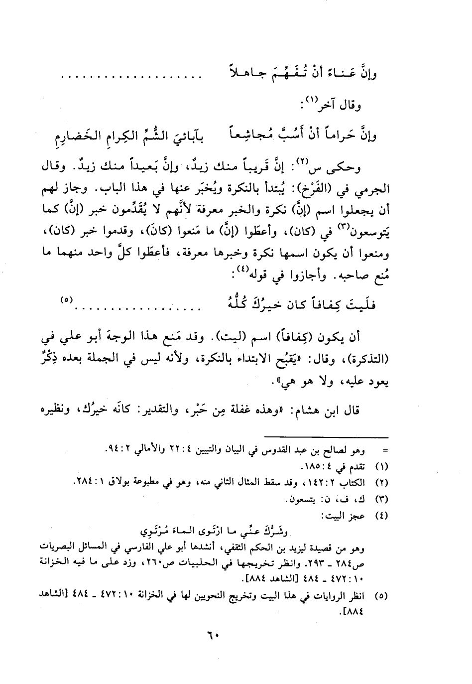 وحكي س: إن قريبًا منك زيد، وإن بعيدًا منك زيد. وقال الجرمي في (الفرخ): يبتدأ بالنكرة ويخبر عنها في هذا الباب. وجاز لهم أن يجعلوا اسم (إن) نكرة والخبر معرفة لأنهم لا يقدمون خبر (إن) كما يتوسعون في (كان)، وأعطوا (إن) ما منعوا (كان)، وقدموا خبر (كان)، ومنعوا أن يكون اسمها نكرة وخبرها معرفة، فأعطوا كل واحد منهما ما منع صاحبه. وأجازوا في قوله: