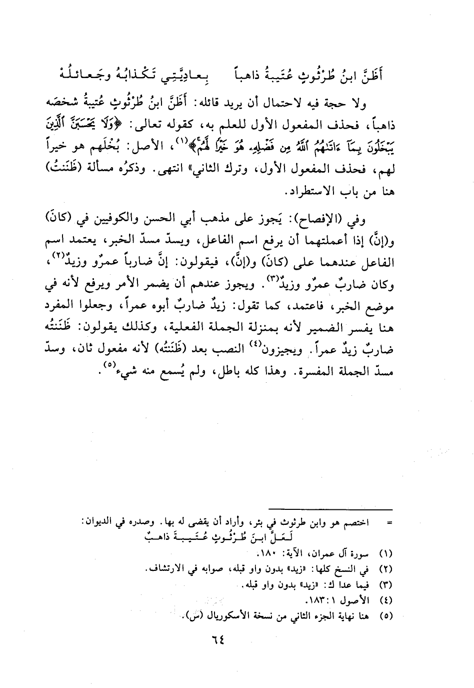 ولا حجة فيه لاحتمال أن يريد قائله: أظن ابن طرثوث عتيبة شخصه ذاهبًا، فحذف المفعول الأول للعلم به، كقوله تعالى: {ولا يَحْسَبَنَّ الَّذِينَ يَبْخَلُونَ بِمَا آتَاهُمُ اللَّهُ مِن فَضْلِهِ هُوَ خَيْرًا لَّهُم}، الأثل: بخلهم هو خيرًا لهم، فحذف المفعول الأول، وترك الثاني" انتهى. وذكره مسألة (ظننت) هنا من باب الاستطراد.