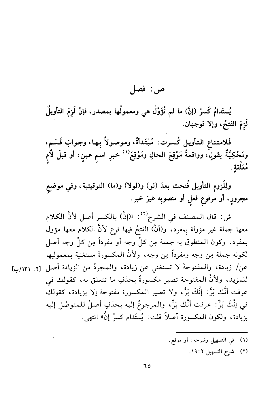 ش: قال المصنف في الشرح: " (إن) بالكسر أصل لأن الكلام معها جملة غير مؤولة بمفرد، و (أن) الفتح فيها فرع لأن الكلام معها مؤول بمفرد، وكون المنطوق به جملة من كل وجه أو مفردًا من كل وجه أصل لكونه جملة من وجه ومفردًا من وجه. ولأن المكسورة مستغنية بمعموليها عن/ زيادة، والمفتوحة لا تستغني عن زيادة، والمجرد من الزيادة أصل للمزيد، ولأن المفتوحة تصير مكسورة بحذف ما تتعلق به، كقولك في عرفت أنك بر: إنك بر، ولا تصير المكسورة مفتوحة إلا بزيادة، كقولك في إنك بر: عرفت أنك بر، والمرجوع إليه بحذف أصل للمتوصل إليه بزيادة، ولكون المكسورة أصلًا قلت: يستدام كسر إن" انتهى.