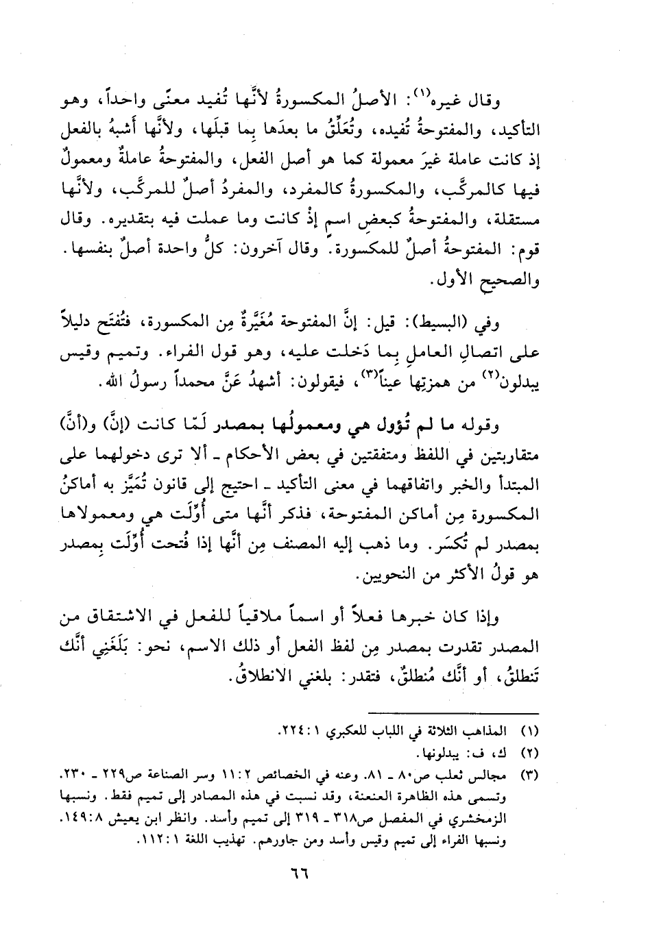 وقال غيره: الأصل المكسورة لأنها تفيد معنى واحدًا، وهو التأكيد، والمفتوحة تفيده، وتعلق ما بعدها بما قبلها، ولأنها أشبه بالفعل إذ كانت عاملة غير معمولة كما هو أصل الفعل، والمفتوحة عاملة ومعمول فيها كالمركب، والمكسورة كالمفرد، والمفرد أصل للمركب، ولأنها مستقلة، والمفتوحة كبعض اسم إذ كانت وما عملت فيه بتقديره. وقال قوم: المفتوحة أصل للمكسورة. وقال آخرون: كل واحدة أصل بنفسها. والصحيح الأول.