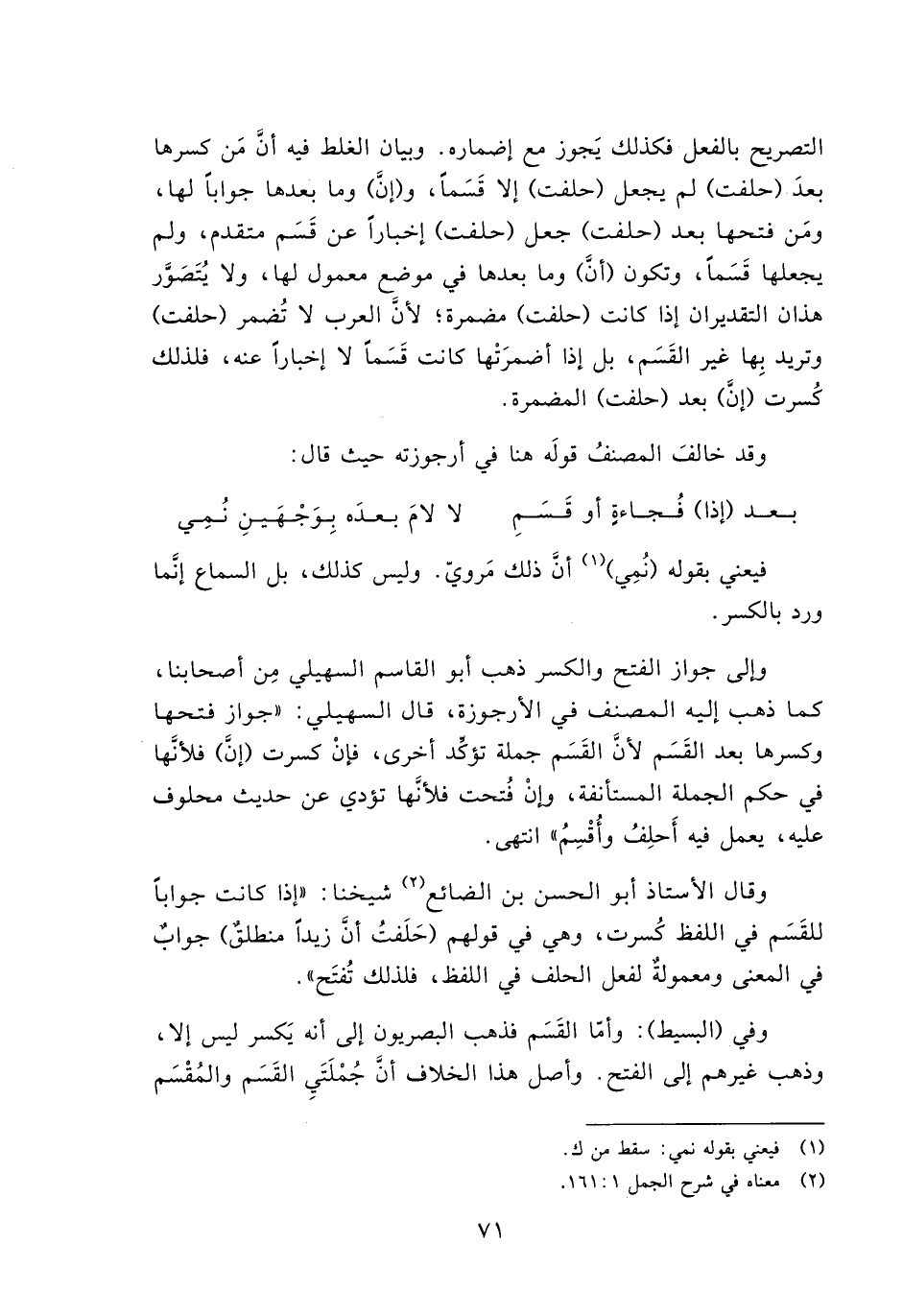 التصريح بالفعل فكذلك يجوز مع إضماره. وبيان الغلط فيه أن من كسرها بعد (حلفت) لم يجعل (حلفت) إلا قسماً, و (إن) وما بعدها جواباً لها, ومن فتحها بعد (حلفت) جعل (حلفت) إخباراً عن قسم متقدم , ولم يجعلها قسماً وتكون (أن) وما بعدها في موضع معمول لها, ولا يتصور هذان التقدير إذا كانت (حلفت) مضمرة, لأن العرب لا تضمر (حلفت) وتريد بها غير القسم, بل إذا أضمرتها بل إذا أضمرتها كانت قسماً لا إخباراً عنه, فلذلك كسرت (إن) بعد (حلفت) المضمرة.