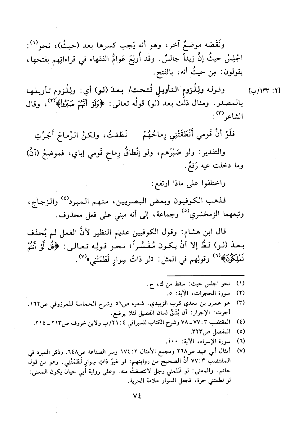 قال ابن هشام: وقول الكوفيين عديم النظير لأن الفعل لم يحذف بعد (لو) قط إلا أن يكون مفسراً, نحو قوله تعالى: {لَّوْ أَنتُمْ تَمْلِكُونَ} وقولهم في المثل:" لو ذات سوار لطمتني".