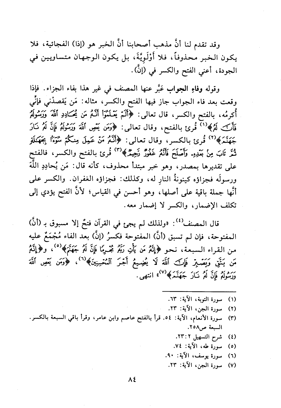 قال المصنف:" ولذلك لم يجئ في القرآن فتح إلا مسبوق بـ (أن) المفتوحة, فإن لم تسبق (أن) المفتوحة فكسر (إن) بعد الفاء مجمع عليه من القراء السبعة نحو {إِنَّهُ مَن يَاتِ رَبَّهُ مُجْرِماً فَإِنَّ لَهُ جَهَنَّمَ} و {إِنَّهُ مَن يَتَّقِ وَيِصْبِرْ فَإِنَّ اللَّهَ لاَ يُضِيعُ أَجْرَ الْمُحْسِنِينَ} , {وَمَن يَعْصِ اللَّهَ وَرَسُولَهُ فَإِنَّ لَهُ نَارَ جَهَنَّمَ} انتهى.