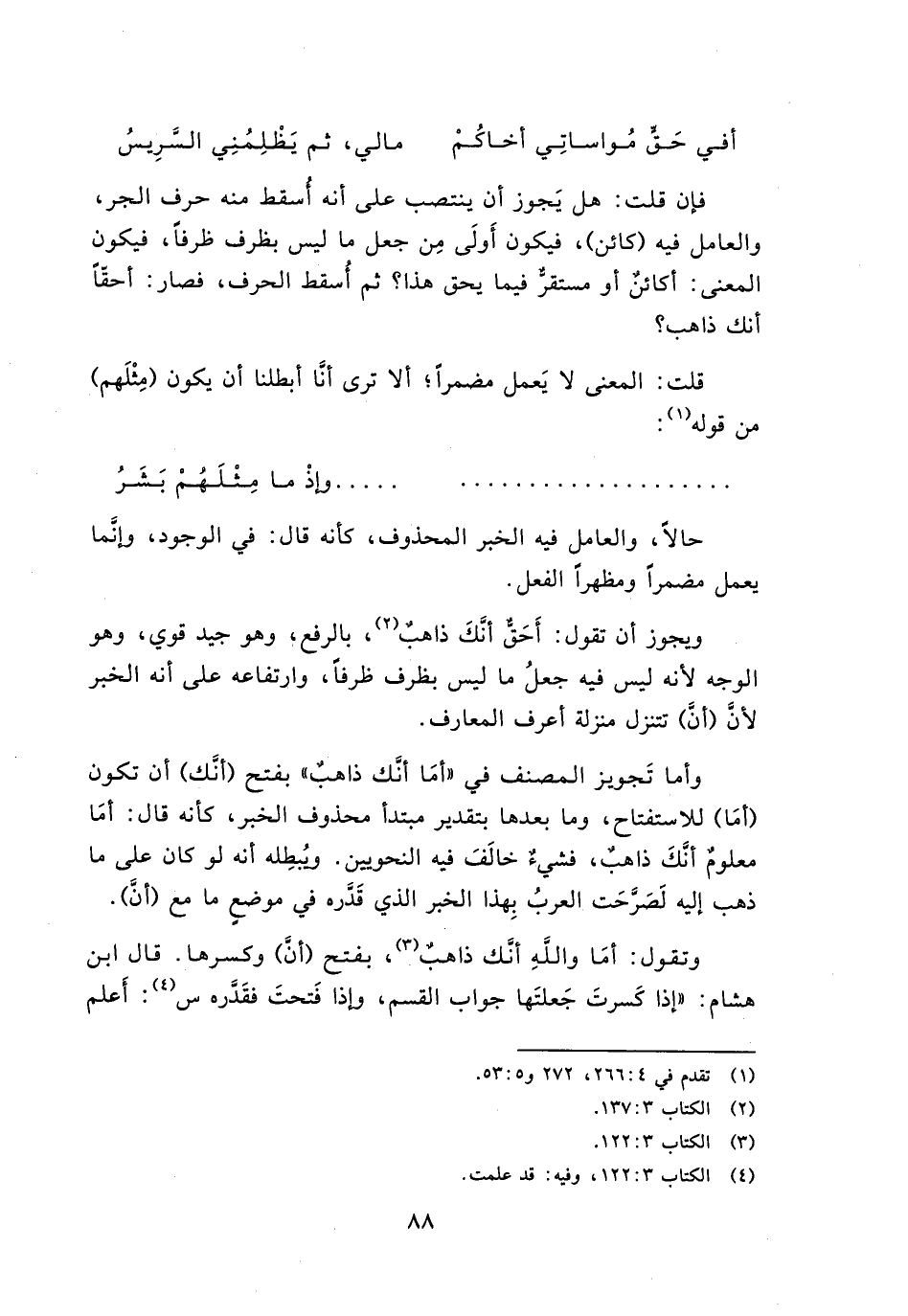 وأما تجويز المصنف في "أما أنك ذاهب" فتح (أنك) أن تكون (أما) للاستفتاح وما بعدها بتقدير مبتدأ محذوف الخبر, كأنه قال: أما معلوم أنك ذاهب, فالشيء خالف فيه النحويين. ويبطله أنه لو كان على ما ذهب إليه لصرحت العرب بهذا الخبر الذي قدره في موضع ما مع (أن).