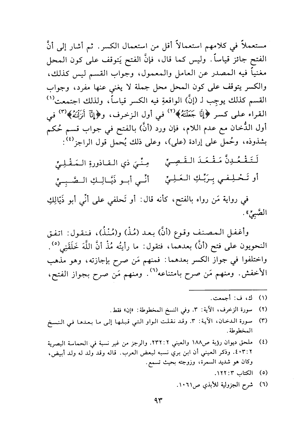 مستعملًا في كلامهم استعمالاً أقل من استعمال الكسر. ثم أشار إلى أن الفتح جائز قياساً. وليس كما قال, فإن الفتح يتوقف على كون المحل مغنياً فيه المصدر عن العامل والمعمول, وجواب القسم ليس كذلك, والكسر كذلك يوجب لـ (إن) الواقعة فيه الكسر قياساً, ولذلك اجتمعت القراء على كسر {إِنَّا جَعَلْنَاهُ} في أول الزخرف, و {إِنَّا أَنزَلْنَاهُ} في أول الدخان مع عدم اللام فإن ورد (أن) بالفتح في جواب قسم حكم بشذوذه وحمل على إرادة (على) وعلى ذلك يحمل قول الراجز: