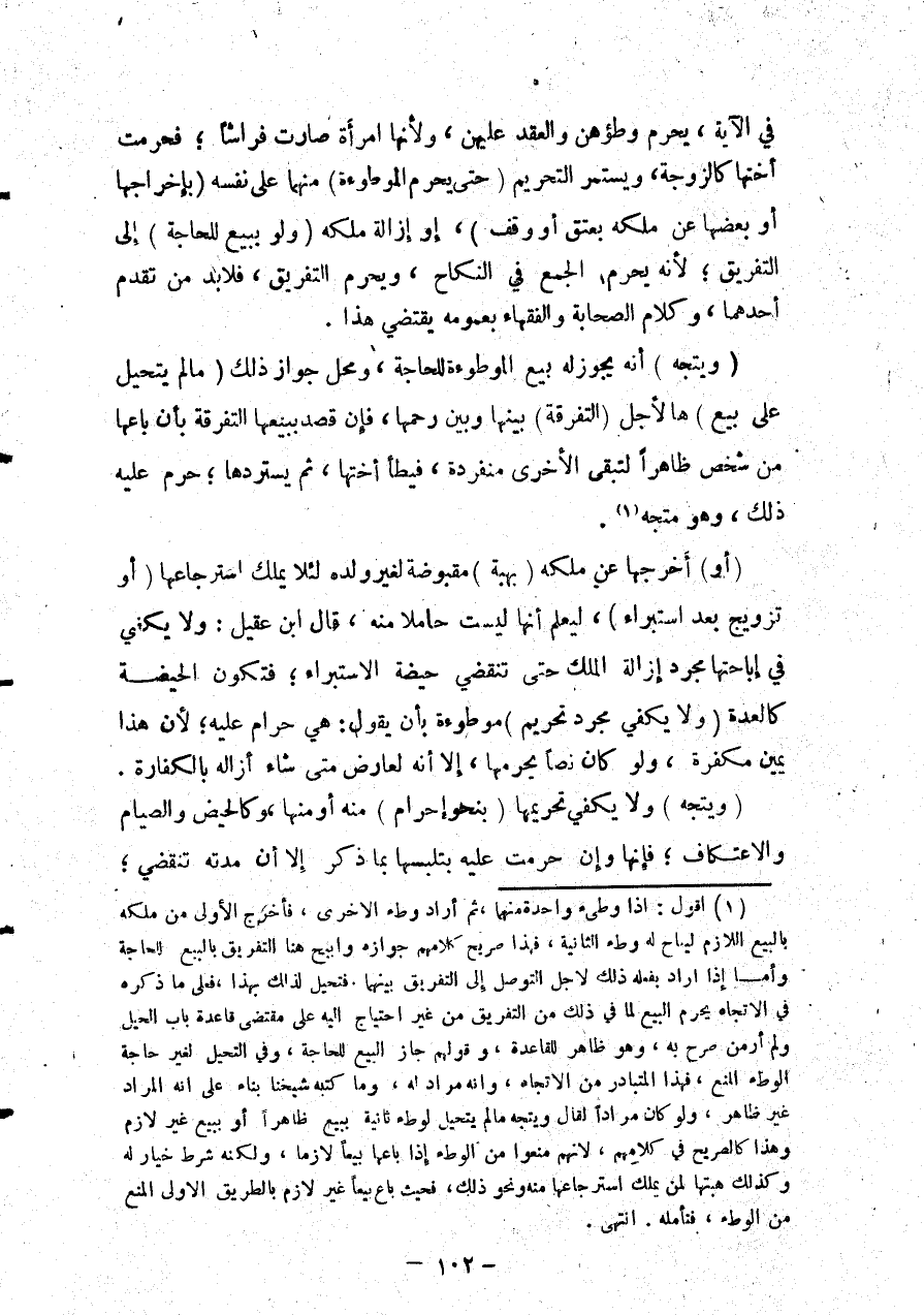 (أَوْ) أَخْرَجَهَا عَنْ مِلْكِهِ (بِهِبَةٍ) مَقْبُوضَةٍ لِغَيْرِ وَلَدِهِ لِئَلَّا يَمْلِكَ اسْتِرْجَاعَهَا (أَوْ تَزْوِيجٍ بَعْدَ اسْتِبْرَاءٍ) ، لِيَعْلَمَ أَنَّهَا لَيْسَتْ حَامِلًا مِنْهُ، قَالَ ابْنُ عَقِيلٍ: وَلَا يَكْفِي فِي إبَاحَتِهَا مُجَرَّدُ إزَالَةِ الْمِلْكِ حَتَّى تَنْقَضِيَ حَيْضَةُ الِاسْتِبْرَاءِ؛ فَتَكُونُ الْحَيْضَةُ كَالْعِدَّةِ (وَلَا يَكْفِي مُجَرَّدُ تَحْرِيمِ) مَوْطُوءَةٍ بِأَنْ يَقُولَ: هِيَ حَرَامٌ عَلَيْهِ؛ لِأَنَّ هَذَا يَمِينٌ مُكَفَّرَةٌ، وَلَوْ كَانَ نَصًّا يُحَرِّمُهَا، إلَّا أَنَّهُ لِعَارِضٍ مَتَى شَاءَ أَزَالَهُ بِالْكَفَّارَةِ.