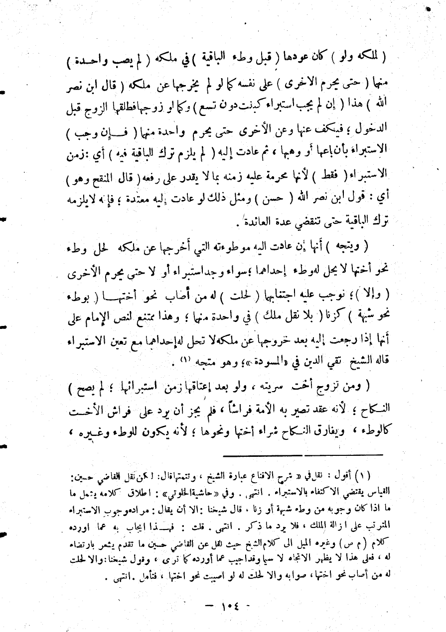 (وَيَتَّجِهُ) أَنَّهَا إنْ عَادَتْ إلَيْهِ مَوْطُوءَتُهُ الَّتِي أَخْرَجَهَا عَنْ مِلْكِهِ لِحِلِّ وَطْءِ نَحْوِ أُخْتِهَا لَا يَحِلُّ لَهُ وَطْءُ إحْدَاهُمَا؛ سَوَاءٌ وُجِدَ اسْتِبْرَاءٌ أَوْ لَا حَتَّى يُحَرِّمَ الْأُخْرَى (وَإِلَّا) ؛ نُوجِبُ عَلَيْهِ اجْتِنَابَهُمَا (لَحَلَّتْ) لَهُ مَنْ أَصَابَ نَحْوَ أُخْتِهَا (بِوَطْءِ نَحْوِ شُبْهَةٍ) كَزِنًا (بِلَا نَقْلِ مِلْكٍ) فِي وَاحِدَةٍ مِنْهُمَا؛ وَهَذَا مُمْتَنِعٌ لِنَصِّ الْإِمَامِ عَلَى أَنَّهَا إذَا رَجَعَتْ إلَيْهِ بَعْدَ خُرُوجِهَا عَنْ مِلْكِهِ لَا تَحِلُّ لَهُ إحْدَاهُمَا مَعَ تَعَيُّنِ الِاسْتِبْرَاءِ قَالَهُ الشَّيْخُ تَقِيُّ الدِّينِ فِي " الْمُسَوَّدَةِ "؛ وَهُوَ مُتَّجِهٌ.