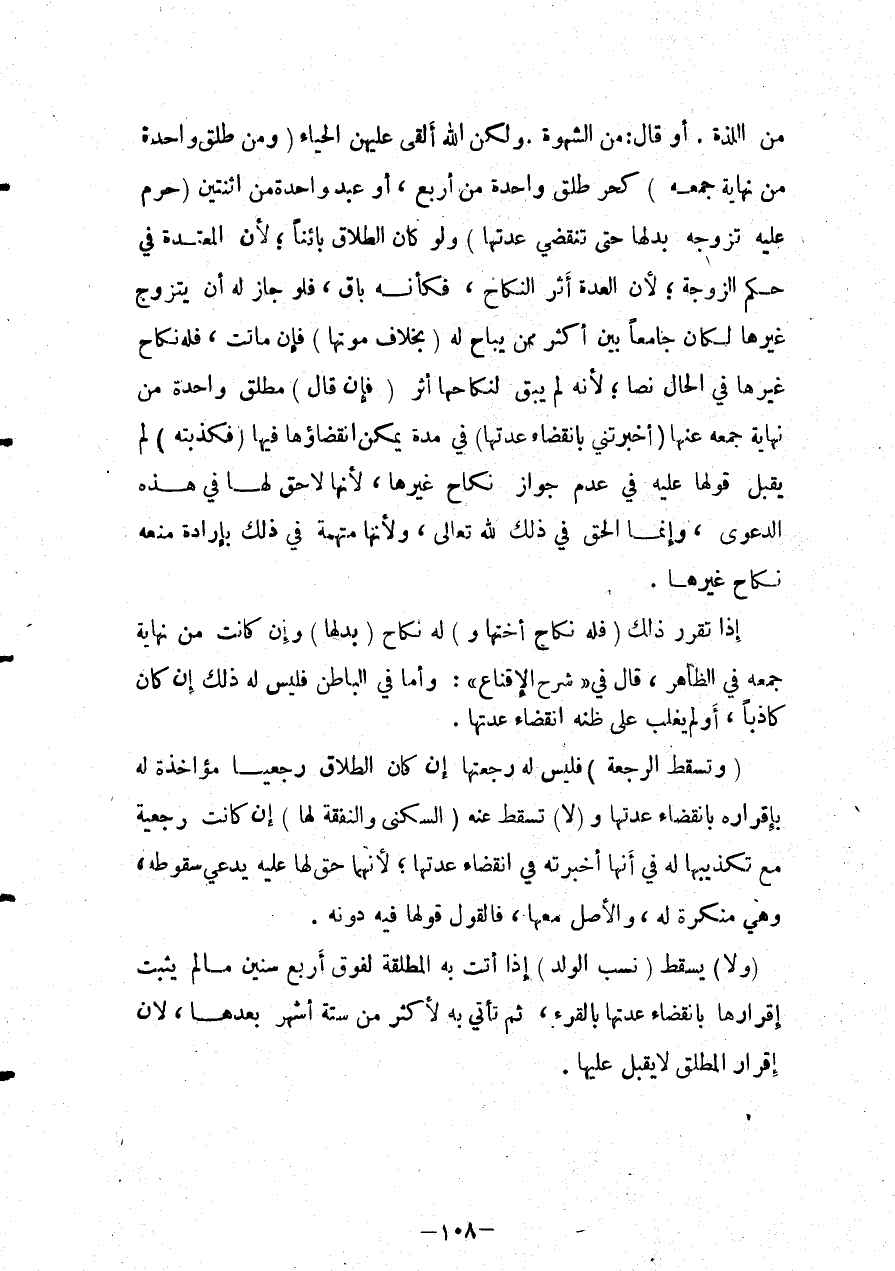 (وَمَنْ طَلَّقَ وَاحِدَةً مِنْ نِهَايَةِ جَمْعِهِ) كَحُرٍّ طَلَّقَ وَاحِدَةً مِنْ أَرْبَعٍ، أَوْ عَبْدٍ وَاحِدَةً مِنْ اثْنَتَيْنِ (حَرُمَ عَلَيْهِ تَزَوُّجُهُ بَدَلَهَا حَتَّى تَنْقَضِيَ عِدَّتُهَا) وَلَوْ كَانَ الطَّلَاقُ بَائِنًا؛ لِأَنَّ الْمُعْتَدَّةَ فِي حُكْمِ الزَّوْجَةِ؛ لِأَنَّ الْعِدَّةَ أَثَرُ النِّكَاحِ، فَكَأَنَّهُ بَاقٍ، فَلَوْ جَازَ لَهُ أَنْ يَتَزَوَّجَ غَيْرَهَا لَكَانَ جَامِعًا بَيْنَ أَكْثَرَ مِمَّنْ يُبَاحُ لَهُ (بِخِلَافِ مَوْتِهَا) فَإِنْ مَاتَتْ، فَلَهُ نِكَاحُ غَيْرِهَا فِي الْحَالِ نَصًّا؛ لِأَنَّهُ لَمْ يَبْقَ لِنِكَاحِهَا أَثَرٌ (فَإِنْ قَالَ) مُطَلِّقُ وَاحِدَةٍ مِنْ نِهَايَةِ جَمْعِهِ عَنْهَا (أَخْبَرَتْنِي بِانْقِضَاءِ عِدَّتِهَا) فِي مُدَّةٍ يُمْكِنُ انْقِضَاؤُهَا فِيهَا (فَكَذَّبَتْهُ) لَمْ يُقْبَلْ قَوْلُهَا عَلَيْهِ فِي عَدَمِ جَوَازِ نِكَاحِ غَيْرِهَا، لِأَنَّهَا لَا حَقَّ لَهَا فِي هَذِهِ الدَّعْوَى، وَإِنَّمَا الْحَقُّ فِي ذَلِكَ لِلَّهِ تَعَالَى، وَلِأَنَّهَا مُتَّهَمَةٌ فِي ذَلِكَ بِإِرَادَةِ مَنْعِهِ نِكَاحَ غَيْرِهَا. إذَا تَقَرَّرَ ذَلِكَ (فَلَهُ نِكَاحُ أُخْتِهَا وَ) لَهُ نِكَاحُ (بَدَلِهَا) وَإِنْ كَانَتْ مِنْ نِهَايَةِ جَمْعِهِ فِي الظَّاهِرِ، قَالَ فِي " شَرْحِ الْإِقْنَاعِ ": وَأَمَّا فِي الْبَاطِنِ فَلَيْسَ لَهُ ذَلِكَ إنْ كَانَ كَاذِبًا، أَوْ لَمْ يَغْلِبْ عَلَى ظَنِّهِ انْقِضَاءُ عِدَّتِهَا. (وَتَسْقُطُ الرَّجْعَةُ) فَلَيْسَ لَهُ رَجْعَتُهَا إنْ كَانَ الطَّلَاقُ رَجْعِيًّا مُؤَاخَذَةً لَهُ بِإِقْرَارِهِ بِانْقِضَاءِ عِدَّتِهَا وَ (لَا) تَسْقُطُ عَنْهُ (السُّكْنَى وَالنَّفَقَةُ لَهَا) إنْ كَانَتْ رَجْعِيَّةً مَعَ تَكْذِيبِهَا لَهُ فِي أَنَّهَا أَخْبَرَتْهُ فِي انْقِضَاءِ عِدَّتِهَا؛ لِأَنَّهُمَا حَقٌّ لَهَا عَلَيْهِ يَدَّعِي سُقُوطَهُ، وَهِيَ مُنْكِرَةٌ لَهُ، وَالْأَصْلُ مَعَهَا، فَالْقَوْلُ قَوْلُهَا فِيهِ دُونَهُ. (وَلَا) يَسْقُطُ (نَسَبُ الْوَلَدِ) إذَا أَتَتْ بِهِ الْمُطَلَّقَةُ لِفَوْقِ أَرْبَعِ سِنِينَ مَا لَمْ يَثْبُتْ إقْرَارُهَا بِانْقِضَاءِ عِدَّتِهَا بِالْقُرْءِ، ثُمَّ تَأْتِي بِهِ لِأَكْثَرَ مِنْ سِتَّةِ أَشْهُرٍ بَعْدَهَا، لِأَنَّ إقْرَارَ الْمُطَلِّقِ لَا يُقْبَلُ عَلَيْهَا.