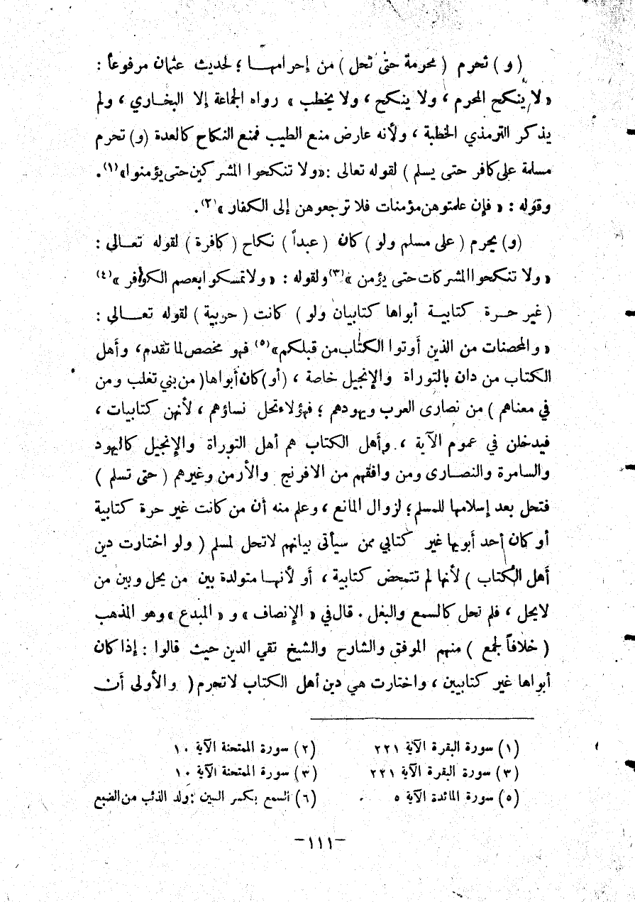(وَ) يَحْرُمُ (عَلَى مُسْلِمٍ وَلَوْ) كَانَ (عَبْدًا) نِكَاحُ (كَافِرَةٍ) لِقَوْلِهِ تَعَالَى {وَلا تَنْكِحُوا الْمُشْرِكَاتِ حَتَّى يُؤْمِنَّ} [البقرة: 221] وَلِقَوْلِهِ {وَلا تُمْسِكُوا بِعِصَمِ الْكَوَافِرِ} [الممتحنة: 10] (غَيْرِ حُرَّةٍ كِتَابِيَّةٍ أَبَوَاهَا كِتَابِيَّانِ وَلَوْ) كَانَتْ (حَرْبِيَّةً) لِقَوْلِهِ تَعَالَى {وَالْمُحْصَنَاتُ مِنَ الَّذِينَ أُوتُوا الْكِتَابَ مِنْ قَبْلِكُمْ} [المائدة: 5] فَهُوَ مُخَصِّصٌ لِمَا تَقَدَّمَ، وَأَهْلُ الْكِتَابِ مَنْ دَانَ بِالتَّوْرَاةِ وَالْإِنْجِيلِ خَاصَّةً، (أَوْ) كَانَ أَبَوَاهَا (مِنْ بَنِي تَغْلِبَ وَمَنْ فِي مَعْنَاهُمْ) مِنْ نَصَارَى الْعَرَبِ وَيَهُودِهِمْ؛ فَهَؤُلَاءِ تَحِلُّ نِسَاؤُهُمْ، لِأَنَّهُنَّ كِتَابِيَّاتٌ، فَيَدْخُلْنَ فِي عُمُومِ الْآيَةِ، وَأَهْلُ الْكِتَابِ هُمْ أَهْلُ التَّوْرَاةِ وَالْإِنْجِيلِ كَالْيَهُودِ وَالسَّامِرَةِ وَالنَّصَارَى وَمَنْ وَافَقَهُمْ مِنْ الْإِفْرِنْجِ وَالْأَرْمَنِ وَغَيْرِهِمْ (حَتَّى تُسْلِمَ) فَتَحِلُّ بَعْدَ إسْلَامِهَا لِلْمُسْلِمِ؛ لِزَوَالِ الْمَانِعِ، وَعُلِمَ مِنْهُ أَنَّ مَنْ كَانَتْ غَيْرَ حُرَّةٍ كِتَابِيَّةً أَوْ كَانَ أَحَدُ أَبَوَيْهَا غَيْرَ كِتَابِيٍّ مِمَّنْ سَيَأْتِي بَيَانُهُمْ لَا تَحِلُّ لِمُسْلِمٍ (وَلَوْ اخْتَارَتْ دِينَ أَهْلِ الْكِتَابِ) لِأَنَّهَا لَمْ تَتَمَحَّضْ كِتَابِيَّةً، أَوْ لِأَنَّهَا مُتَوَلَّدَةٌ بَيْنَ مَنْ يَحِلُّ وَبَيْنَ مَنْ لَا يَحِلُّ، فَلَمْ تَحِلَّ كَالسِّمْعِ وَالْبَغْلِ. قَالَ فِي " الْإِنْصَافِ " " وَالْمُبْدِعِ " وَهُوَ الْمَذْهَبُ (خِلَافًا لِجَمْعٍ) مِنْهُمْ الْمُوَفَّقُ وَالشَّارِحُ وَالشَّيْخُ تَقِيُّ الدِّينِ حَيْثُ قَالُوا: إذَا كَانَ أَبَوَاهَا غَيْرَ كِتَابِيَّيْنِ، وَاخْتَارَتْ هِيَ دِينُ أَهْلِ الْكِتَابِ لَا تَحْرُمُ (وَالْأَوْلَى أَنْ