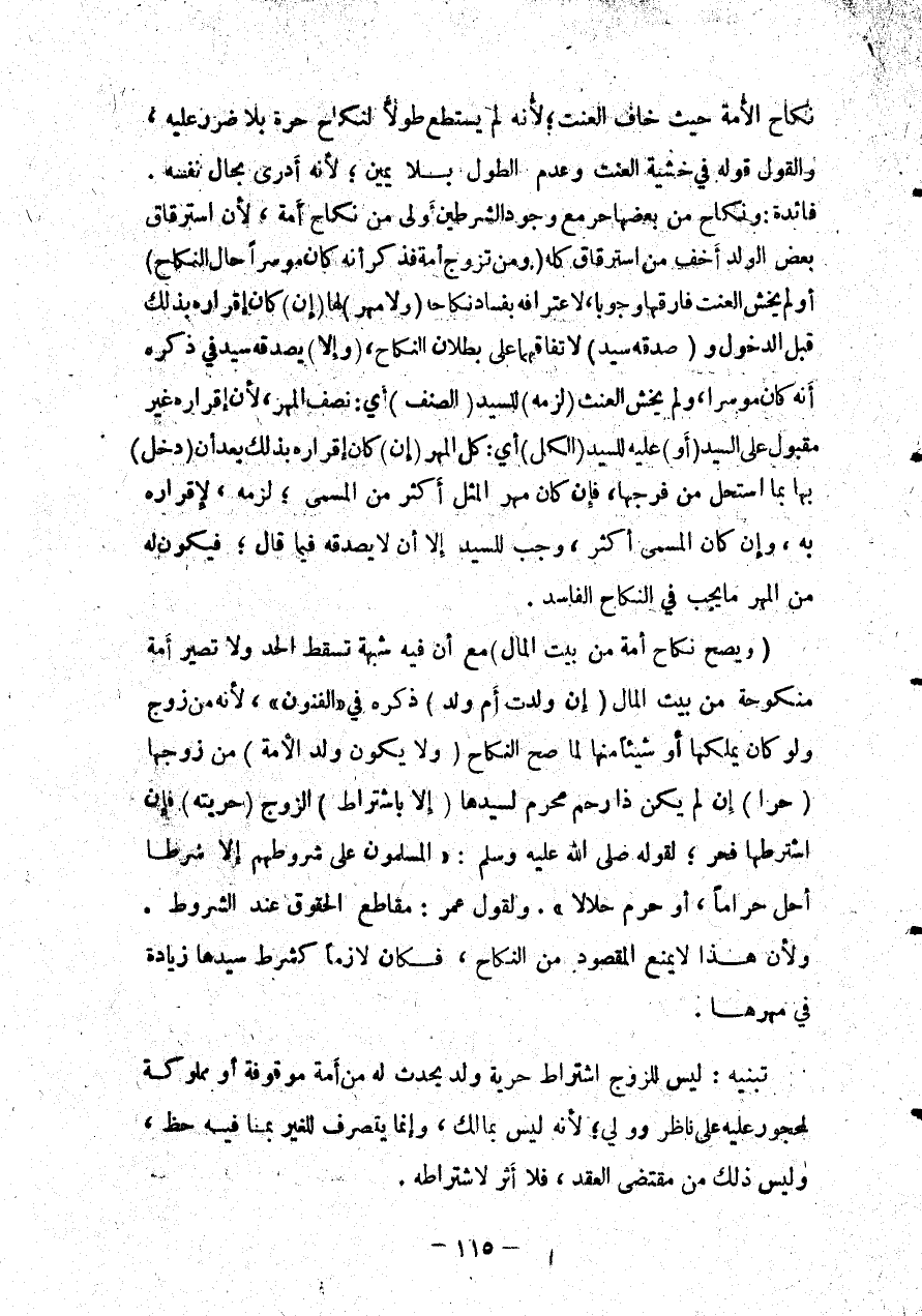 تَنْبِيهٌ: لَيْسَ لِلزَّوْجِ اشْتِرَاطُ حُرِّيَّةِ وَلَدٍ يَحْدُثُ لَهُ مِنْ أَمَةٍ مَوْقُوفَةٍ أَوْ مَمْلُوكَةٍ لِمَحْجُورٍ عَلَيْهِ عَلَى نَاظِرٍ وَوَلِيٍّ؛ لِأَنَّهُ لَيْسَ بِمَالِكٍ، وَإِنَّمَا يَتَصَرَّفُ لِلْغَيْرِ بِمَا فِيهِ حَظٌّ، وَلَيْسَ ذَلِكَ مِنْ مُقْتَضَى الْعَقْدِ، فَلَا أَثَرَ لِاشْتِرَاطِهِ.
