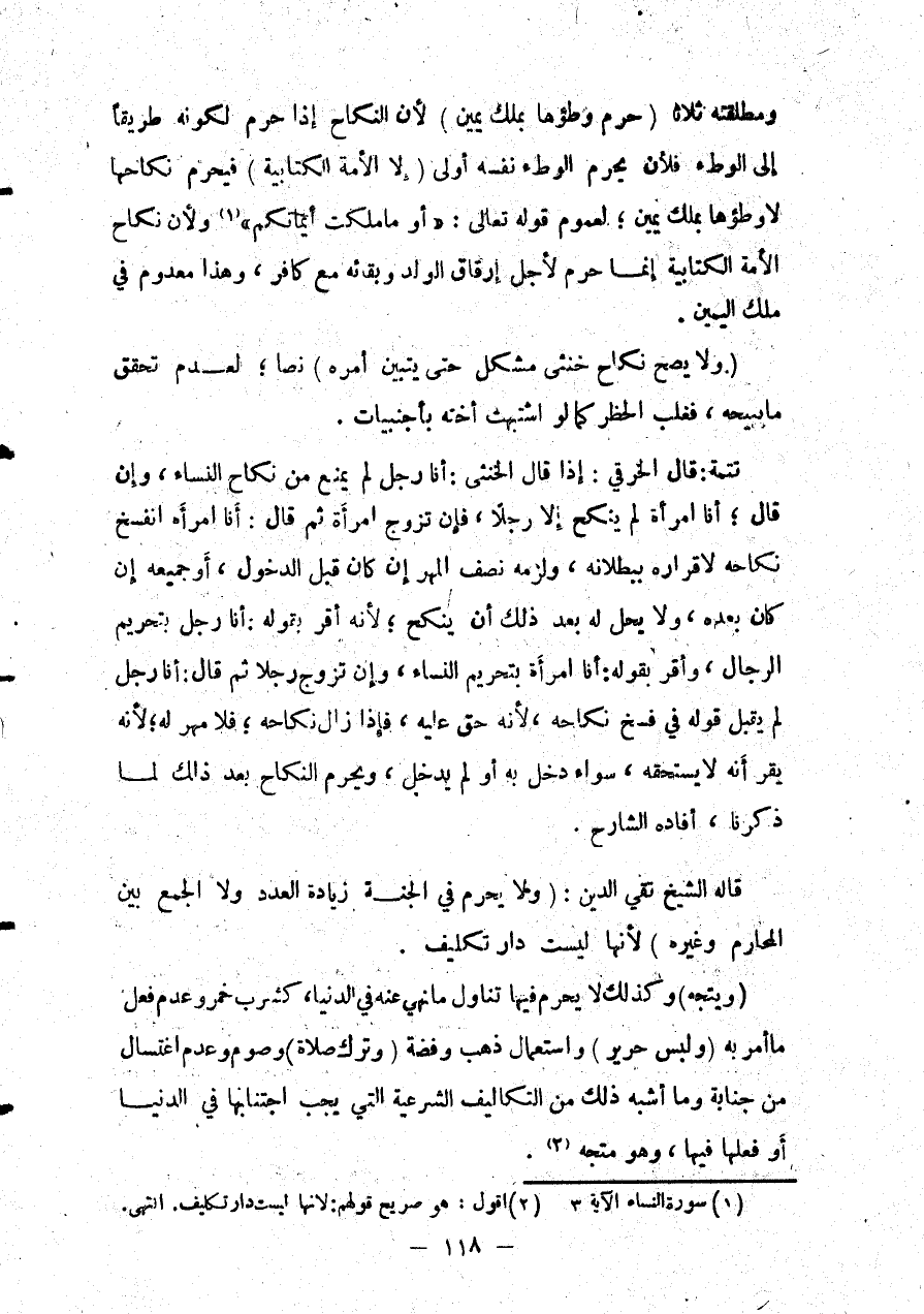 (وَلَا يَحْرُمُ فِي الْجَنَّةِ زِيَادَةُ الْعَدَدِ وَلَا الْجَمْعُ بَيْنَ الْمَحَارِمِ وَغَيْرِهِ) لِأَنَّهَا لَيْسَتْ دَارَ تَكْلِيفٍ. (وَيَتَّجِهُ) وَكَذَلِكَ لَا يَحْرُمُ فِيهَا تَنَاوُلُ مَا نُهِيَ عَنْهُ فِي الدُّنْيَا، كَشُرْبِ خَمْرٍ وَعَدَمِ فِعْلِ مَا أَمَرَ بِهِ (وَلُبْسِ حَرِيرٍ) وَاسْتِعْمَالُ ذَهَبٍ وَفِضَّةٍ (وَتَرْكُ صَلَاةٍ) وَصَوْمٌ وَعَدَمُ اغْتِسَالٍ مِنْ جَنَابَةٍ وَمَا أَشْبَهَ ذَلِكَ مِنْ التَّكَالِيفِ الشَّرْعِيَّةِ الَّتِي يَجِبُ اجْتِنَابُهَا فِي الدُّنْيَا أَوْ فِعْلُهَا فِيهَا، وَهُوَ مُتَّجِهٌ.