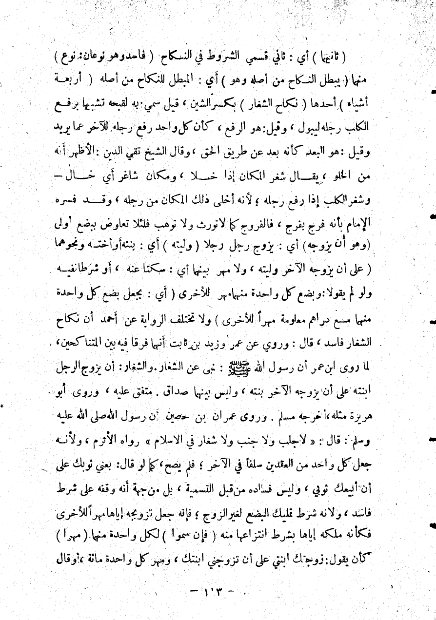 (ثَانِيهِمَا) أَيْ: ثَانِي قِسْمَيْ الشُّرُوطِ فِي النِّكَاحِ (فَاسِدٌ، وَهُوَ نَوْعَانِ: نَوْعٌ) مِنْهُمَا (يُبْطِلُ النِّكَاحَ مِنْ أَصْلِهِ وَهُوَ) أَيْ: الْمُبْطِلُ لِلنِّكَاحِ مِنْ أَصْلِهِ (أَرْبَعَةُ أَشْيَاءَ) أَحَدُهَا - (نِكَاحُ الشِّغَارِ) بِكَسْرِ الشِّينِ، قِيلَ: سُمِّيَ بِهِ لِقُبْحِهِ تَشْبِيهًا بِرَفْعِ الْكَلْبِ رِجْلَهُ لِيَبُولَ، وَقِيلَ: هُوَ الرَّفْعُ، كَأَنَّ كُلَّ وَاحِدٍ رَفَعَ رِجْلَهُ لِلْآخَرِ عَمَّا يُرِيدُ، وَقِيلَ: هُوَ الْبُعْدُ كَأَنَّهُ بَعُدَ عَنْ طَرِيقِ الْحَقِّ، وَقَالَ الشَّيْخُ تَقِيُّ الدِّينِ: الْأَظْهَرُ أَنَّهُ مِنْ الْخُلُوِّ، يُقَالُ: شَغَرَ الْمَكَانُ إذَا خَلَا، وَمَكَانٌ شَاغِرٌ أَيْ خَالٍ - وَشَغَرَ الْكَلْبُ إذَا رَفَعَ رِجْلَهُ؛ لِأَنَّهُ أَخْلَى ذَلِكَ الْمَكَانَ مِنْ رِجْلِهِ، وَقَدْ فَسَّرَهُ الْإِمَامُ بِأَنَّهُ فَرْجٌ بِفَرْجٍ، فَالْفُرُوجُ كَمَا لَا تُورَثُ وَلَا تُوهَبُ فَلِئَلَّا تُعَاوَضَ بِبُضْعٍ أَوْلَى (وَهُوَ أَنْ يُزَوِّجَهُ) أَيْ: يُزَوِّجُ رَجُلٌ رَجُلًا (وَلِيَّتَهُ) أَيْ: بِنْتَهُ أَوْ أُخْتَهُ وَنَحْوَهُمَا (عَلَى أَنْ يُزَوِّجَهُ الْآخَرُ وَلِيَّتَهُ، وَلَا مَهْرَ بَيْنَهُمَا) أَيْ: سَكَتَا عَنْهُ، أَوْ شَرَطَا نَفْيَهُ وَلَوْ لَمْ يَقُولَا: وَبُضْعُ كُلِّ وَاحِدَةٍ مِنْهُمَا مَهْرٌ لِلْأُخْرَى (أَيْ: يُجْعَلُ بُضْعُ كُلِّ وَاحِدَةٍ مِنْهُمَا مَعَ دَرَاهِمَ مَعْلُومَةٍ مَهْرًا لِلْأُخْرَى) وَلَا تَخْتَلِفُ الرِّوَايَةُ عَنْ أَحْمَدَ أَنَّ نِكَاحَ الشِّغَارِ فَاسِدٌ، قَالَ: وَرُوِيَ عَنْ عُمَرَ وَزَيْدِ بْنِ ثَابِتٍ أَنَّهُمَا فَرَّقَا فِيهِ بَيْنَ الْمُتَنَاكِحَيْنِ، لِمَا رَوَى ابْنُ عُمَرَ «أَنَّ رَسُولَ اللَّهِ - صَلَّى اللَّهُ عَلَيْهِ وَسَلَّمَ -: نَهَى عَنْ الشِّغَارِ. وَالشِّغَارُ: أَنْ يُزَوِّجَ الرَّجُلُ ابْنَتَهُ عَلَى أَنْ يُزَوِّجَهُ الْآخَرُ بِنْتَهُ، وَلَيْسَ بَيْنَهُمَا صَدَاقٌ» . مُتَّفَقٌ عَلَيْهِ، وَرَوَى أَبُو هُرَيْرَةَ مِثْلَهُ، أَخْرَجَهُ مُسْلِمٌ. وَرَوَى عِمْرَانُ بْنُ حُصَيْنٍ أَنَّ رَسُولَ اللَّهِ - صَلَّى اللَّهُ عَلَيْهِ وَسَلَّمَ -: قَالَ: «لَا جَلَبَ وَلَا جَنْبَ وَلَا شِغَارَ فِي الْإِسْلَامِ» رَوَاهُ الْأَثْرَمُ، وَلِأَنَّهُ جَعَلَ كُلَّ وَاحِدٍ مِنْ الْعَقْدَيْنِ سَلَفًا فِي الْآخَرِ؛ فَلَمْ يَصِحَّ، كَمَا لَوْ قَالَ: بِعْنِي ثَوْبَك عَلَى أَنْ أَبِيعُك ثَوْبِي، وَلَيْسَ فَسَادُهُ مِنْ قِبَلِ التَّسْمِيَةِ، بَلْ مِنْ جِهَةِ أَنَّهُ وَقَفَهُ عَلَى شَرْطٍ فَاسِدٍ، وَلِأَنَّهُ شَرْطُ تَمْلِيكِ الْبُضْعِ لِغَيْرِ الزَّوْجِ؛ فَإِنَّهُ جَعَلَ تَزْوِيجَهُ إيَّاهَا مَهْرًا لِلْأُخْرَى فَكَأَنَّهُ مَلَّكَهُ إيَّاهَا بِشَرْطِ انْتِزَاعِهَا مِنْهُ.
