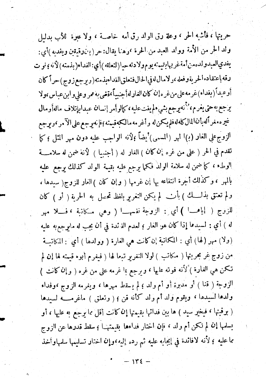 حُرِّيَّتَهَا، فَأَشْبَهَ الْحُرَّ، وَعِلَّةُ رِقِّ الْوَلَدِ رِقُّ أُمِّهِ خَاصَّةً، وَلَا عِبْرَةَ لِلْأَبِ بِدَلِيلِ وَلَدِ الْحُرِّ مِنْ الْأَمَةِ وَوَلَدِ الْعَبْدِ مِنْ الْحُرَّةِ، وَهُنَا يُقَالُ: حُرٌّ (بَيْنَ رَقِيقَيْنِ وَيَفْدِيهِ) أَيْ: يَفْدِي الْعَبْدُ وَلَدَهُ مِنْ أَمَةٍ غُرَّ بِهَا بِقِيمَتِهِ يَوْمَ وِلَادَتِهِ حَيًّا (لِتَعَلُّقِهِ) أَيْ: الْفِدَاءِ (بِذِمَّتِهِ) ؛ لِأَنَّهُ؛ فَوَّتَ رِقَّهُ بِاعْتِقَادِهِ الْحُرِّيَّةَ وَفِعْلِهِ، وَلَا مَالَ لَهُ فِي الْحَالِ فَتَعَلَّقَ الْفِدَاءُ بِذِمَّتِهِ.