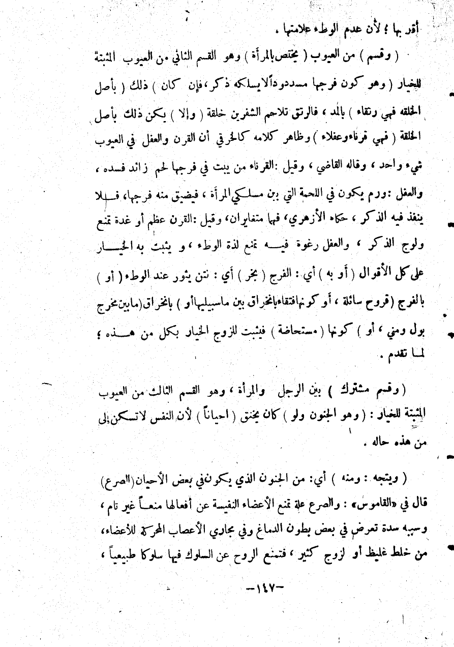 (وَقِسْمٌ مُشْتَرَكٌ) بَيْنَ الرَّجُلِ وَالْمَرْأَةِ، وَهُوَ الْقِسْمُ الثَّالِثُ مِنْ الْعُيُوبِ الْمُثَبِّتَةِ لِلْخِيَارِ: (وَهُوَ الْجُنُونُ وَلَوْ) كَانَ يُخْنَقُ (أَحْيَانًا) لِأَنَّ النَّفْسَ لَا تَسْكُنُ إلَى مَنْ هَذِهِ حَالُهُ. (وَيَتَّجِهُ: وَمِنْهُ) أَيْ: مِنْ الْجُنُونِ الَّذِي يَكُونُ فِي بَعْضِ الْأَحْيَانِ (الصَّرْعُ) قَالَ فِي " الْقَامُوسِ ": وَالصَّرْعُ عِلَّةٌ تَمْنَعُ الْأَعْضَاءَ النَّفْسِيَّةِ عَنْ أَفْعَالِهَا مَنْعًا غَيْرَ تَامٍّ، وَسَبَبُهُ سُدَّةٌ تَعْرِضُ فِي بَعْضِ بُطُونِ الدِّمَاغِ وَفِي مَجَارِي الْأَعْصَابِ الْمُحَرِّكَةِ لِلْأَعْضَاءِ، مِنْ خَلْطٍ غَلِيظٍ أَوْ لِزَوْجٍ كَثِيرٍ، فَتَمْنَعُ الرُّوحَ عَنْ السُّلُوكِ فِيهَا سُلُوكًا طَبِيعِيًّا،