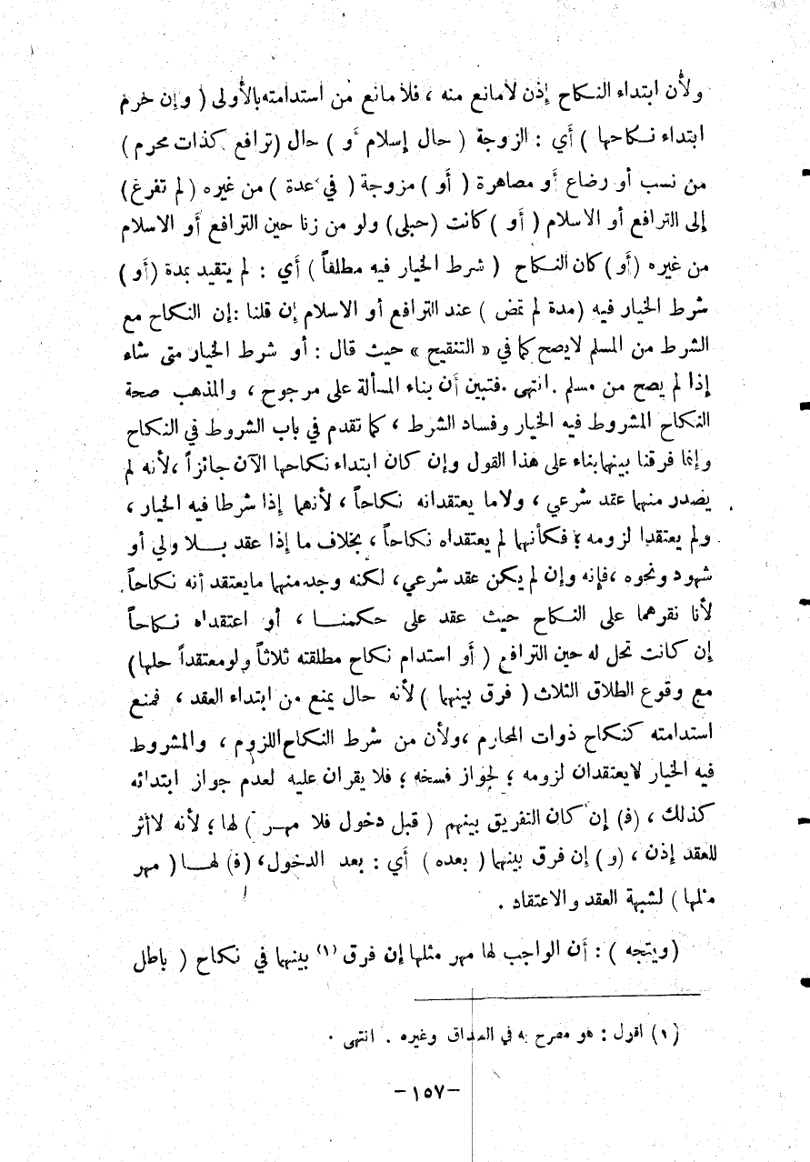 وَلِأَنَّ ابْتِدَاءَ النِّكَاحِ إذَنْ لَا مَانِعَ مِنْهُ، فَلَا مَانِعَ مِنْ اسْتِدَامَتِهِ بِالْأَوْلَى (وَإِنْ حَرُمَ ابْتِدَاءُ نِكَاحِهَا) أَيْ: الزَّوْجَةِ (حَالَ إسْلَامٍ أَوْ) حَالَ (تَرَافُعٍ كَذَاتِ مَحْرَمٍ) مِنْ نَسَبٍ أَوْ رَضَاعٍ أَوْ مُصَاهَرَةٍ (أَوْ) مُزَوَّجَةٍ (فِي عِدَّةٍ) مِنْ غَيْرِهِ (لَمْ تَفْرُغْ) إلَى التَّرَافُعِ أَوْ الْإِسْلَامِ (أَوْ) كَانَتْ (حُبْلَى) وَلَوْ مِنْ زِنًا حِينَ التَّرَافُعِ أَوْ الْإِسْلَامِ مِنْ غَيْرِهِ (أَوْ) كَانَ النِّكَاحُ (شُرِطَ الْخِيَارُ فِيهِ مُطْلَقًا) أَيْ: لَمْ يَتَقَيَّدْ بِمُدَّةٍ (أَوْ) شُرِطَ الْخِيَارُ فِيهِ (مُدَّةً لَمْ تَمْضِ) عِنْدَ التَّرَافُعِ أَوْ الْإِسْلَامِ إنْ قُلْنَا: إنَّ النِّكَاحَ مَعَ الشَّرْطِ مِنْ الْمُسْلِمِ لَا يَصِحُّ كَمَا فِي " التَّنْقِيحِ " حَيْثُ قَالَ: أَوْ شَرَطَ الْخِيَارَ مَتَى شَاءَ إذَا لَمْ يَصِحَّ مِنْ مُسْلِمٍ انْتَهَى. فَتَبَيَّنَ أَنَّ بِنَاءَ الْمَسْأَلَةِ عَلَى مَرْجُوحٍ وَالْمَذْهَبُ صِحَّةُ النِّكَاحِ الْمَشْرُوطِ فِيهِ الْخِيَارُ وَفَسَادُ الشَّرْطِ، كَمَا تَقَدَّمَ فِي بَابِ الشُّرُوطِ فِي النِّكَاحِ وَإِنَّمَا فَرَّقْنَا بَيْنَهُمَا بِنَاءً عَلَى هَذَا الْقَوْلِ وَإِنْ كَانَ ابْتِدَاءُ نِكَاحِهَا الْآنَ جَائِزًا، لِأَنَّهُ لَمْ يَصْدُرْ مِنْهُمَا عَقْدٌ شَرْعِيٌّ، وَلَا مَا يَعْتَقِدَانِهِ نِكَاحًا، لِأَنَّهُمَا إذَا شَرَطَا فِيهِ الْخِيَارَ، وَلَمْ يَعْتَقِدَا لُزُومَهُ؛ فَكَأَنَّهُمَا لَمْ يَعْتَقِدَاهُ نِكَاحًا، بِخِلَافِ مَا إذَا عُقِدَ بِلَا وَلِيٍّ أَوْ شُهُودٍ وَنَحْوِهِ، فَإِنَّهُ وَإِنْ لَمْ يَكُنْ عَقْدٌ شَرْعِيٌّ، لَكِنَّهُ وُجِدَ مِنْهُمَا مَا يَعْتَقِدَانِهِ نِكَاحًا لِأَنَّا نُقِرُّهُمَا عَلَى النِّكَاحِ حَيْثُ عُقِدَ عَلَى حُكْمِنَا، أَوْ اعْتَقَدَاهُ نِكَاحًا إنْ كَانَتْ تَحِلُّ لَهُ حِينَ التَّرَافُعِ (أَوْ اسْتَدَامَ نِكَاحُ مُطَلَّقَتِهِ ثَلَاثًا وَلَوْ مُعْتَقِدًا حِلَّهَا) مَعَ وُقُوعِ الطَّلَاقِ الثَّلَاثِ (فَرَّقَ بَيْنَهُمَا) لِأَنَّهُ حَالٌ يَمْنَعُ مِنْ ابْتِدَاءِ الْعَقْدِ، فَمَنَعَ اسْتِدَامَتَهُ كَنِكَاحِ ذَوَاتِ الْمَحَارِمِ، وَلِأَنَّ مِنْ شَرْطِ النِّكَاحِ اللُّزُومَ، وَالْمَشْرُوطُ فِيهِ الْخِيَارُ لَا يَعْتَقِدَانِ لُزُومَهُ؛ لِجَوَازِ فَسْخِهِ؛ فَلَا يُقَرَّانِ عَلَيْهِ لِعَدَمِ جَوَازِ ابْتِدَائِهِ كَذَلِكَ، (فَ) إنْ كَانَ التَّفْرِيقُ بَيْنَهُمْ (قَبْلَ دُخُولٍ فَلَا مَهْرَ) لَهَا؛ لِأَنَّهُ لَا أَثَرَ لِلْعَقْدِ إذَنْ، (وَ) إنْ فَرَّقَ بَيْنَهُمَا (بَعْدَهُ) أَيْ: بَعْدَ الدُّخُولِ، (فَ) لَهَا (مَهْرُ مِثْلِهَا) لِشُبْهَةِ الْعَقْدِ وَالِاعْتِقَادِ