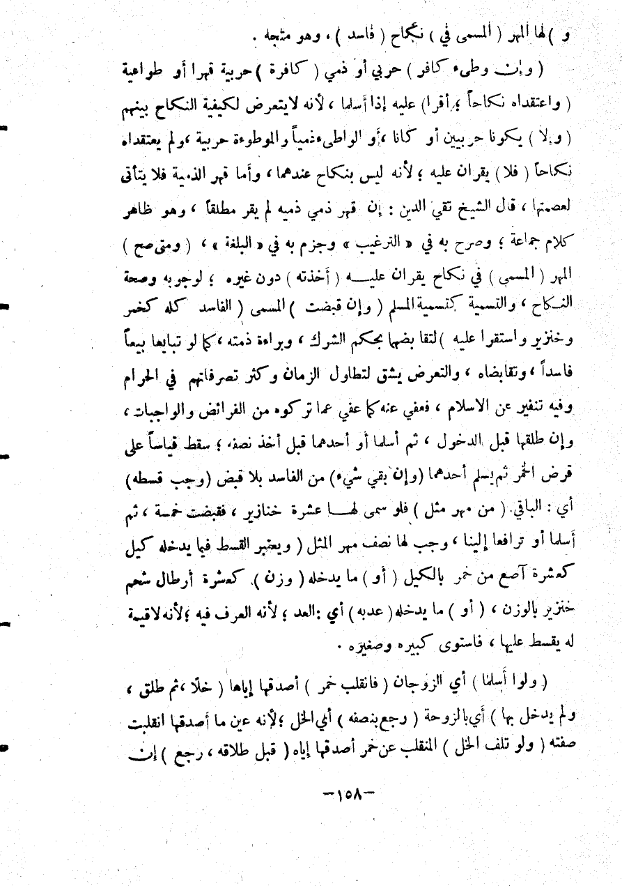 (وَإِنْ قَبَضَتْ) الْمُسَمَّى (الْفَاسِدَ كُلَّهُ كَخَمْرٍ وَخِنْزِيرٍ وَاسْتَقَرَّا عَلَيْهِ) لِتَقَابُضِهِمَا بِحُكْمِ الشِّرْكِ، وَبَرَاءَةِ ذِمَّتِهِ، كَمَا لَوْ تَبَايَعَا بَيْعًا فَاسِدًا، وَتَقَابَضَاهُ، وَالتَّعَرُّضُ يَشُقُّ لِتَطَاوُلِ الزَّمَانِ وَكَثْرَةِ تَصَرُّفَاتِهِمْ فِي الْحَرَامِ وَفِيهِ تَنْفِيرٌ عَنْ الْإِسْلَامِ، فَعُفِيَ عَنْهُ كَمَا عُفِيَ عَمَّا تَرَكُوهُ مِنْ الْفَرَائِضِ وَالْوَاجِبَاتِ، وَإِنْ طَلَّقَهَا قَبْلَ الدُّخُولِ، ثُمَّ أَسْلَمَا أَوْ أَحَدُهُمَا قَبْلَ أَخْذِ نِصْفِهِ؛ سَقَطَ قِيَاسًا عَلَى فَرْضِ الْخَمْرِ ثُمَّ يُسْلِمُ أَحَدُهُمَا (وَإِنْ بَقِيَ شَيْءٌ) مِنْ الْفَاسِدِ بِلَا قَبْضٍ (وَجَبَ قِسْطُهُ) أَيْ: الْبَاقِي (مِنْ مَهْرِ مِثْلٍ) فَلَوْ سَمَّى لَهَا عَشَرَةَ خَنَازِيرَ، فَقَبَضَتْ خَمْسَةً، ثُمَّ أَسْلَمَا أَوْ تَرَافَعَا إلَيْنَا، وَجَبَ لَهَا نِصْفُ مَهْرِ الْمِثْلِ وَيُعْتَبَرُ الْقِسْطُ فِيمَا يَدْخُلُهُ كَيْلٌ كَعَشَرَةِ آصُعٍ مِنْ خَمْرٍ بِالْكَيْلِ (أَوْ) مَا يَدْخُلُهُ (وَزْنٌ) كَعَشَرَةِ أَرْطَالِ شَحْمِ خِنْزِيرٍ بِالْوَزْنِ، (أَوْ) مَا يَدْخُلُهُ (عُدَّ بِهِ) أَيْ: الْعَدِّ؛ لِأَنَّهُ الْعُرْفُ فِيهِ؛ لِأَنَّهُ لَا قِيمَةَ لَهُ يُقَسَّطُ عَلَيْهَا، فَاسْتَوَى كَبِيرُهُ وَصَغِيرُهُ.