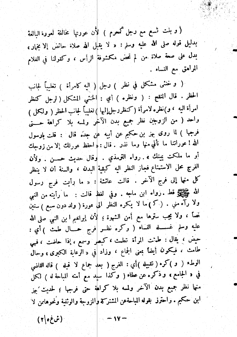 (وَخُنْثَى مُشْكِلٌ فِي نَظَرِ) رَجُلٍ (إلَيْهِ كَامْرَأَةٍ) تَغْلِيبًا لِجَانِبِ الْحَظْرِ. قَالَ الْمُنَقِّحُ: (وَنَظَرُهُ) أَيْ: الْخُنْثَى الْمُشْكِلِ (لِرَجُلٍ كَنَظَرِ امْرَأَةٍ إلَيْهِ، وَ) نَظَرُهُ لِامْرَأَةٍ (كَنَظَرِ رَجُلٍ إلَيْهَا) تَغْلِيبًا لِجَانِبِ الْحَظْرِ (وَلِكُلِّ) وَاحِدٍ (مِنْ الزَّوْجَيْنِ نَظَرُ جَمِيعِ بَدَنِ الْآخَرِ وَلَمْسِهِ بِلَا كَرَاهَةٍ حَتَّى فَرْجِهَا) لِمَا رَوَى بَهْزُ بْنُ حَكِيمٍ عَنْ أَبِيهِ عَنْ جَدِّهِ قَالَ: «قُلْت: يَا رَسُولَ اللَّهِ، عَوْرَاتُنَا مَا نَأْتِي مِنْهَا وَمَا نَذَرُ، قَالَ: احْفَظْ عَوْرَتَك إلَّا مِنْ زَوْجِك أَوْ مَا مَلَكَتْ يَمِينُك» . رَوَاهُ التِّرْمِذِيُّ وَقَالَ: حَدِيثٌ حَسَنٌ؛ لِأَنَّ الْفَرْجَ مَحَلُّ الِاسْتِمْتَاعِ فَجَازَ النَّظَرُ إلَيْهِ كَبَقِيَّةِ الْبَدَنِ، وَالسُّنَّةُ أَنْ لَا يَنْظُرَ كُلٌّ مِنْهُمَا إلَى فَرْجِ الْآخَرِ. قَالَتْ عَائِشَةُ: «مَا رَأَيْت فَرْجَ رَسُولِ اللَّهِ - صَلَّى اللَّهُ عَلَيْهِ وَسَلَّمَ - قَطُّ» . رَوَاهُ ابْنُ مَاجَهْ. وَفِي لَفْظٍ «قَالَتْ: مَا رَأَيْتُهُ مِنْ النَّبِيِّ وَلَا رَآهُ مِنِّي»