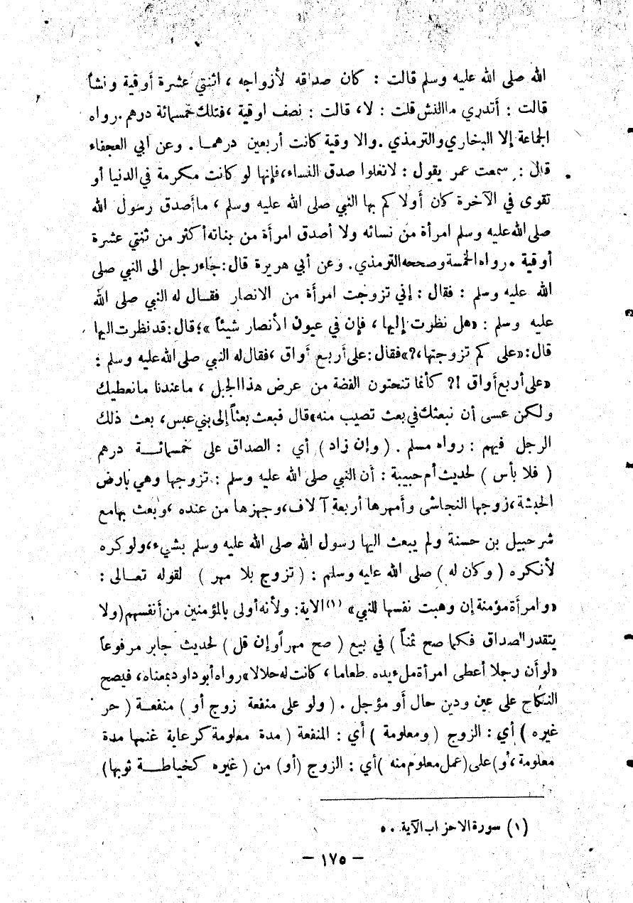 اللَّهِ - صَلَّى اللَّهُ عَلَيْهِ وَسَلَّمَ - قَالَتْ: كَانَ صَدَاقُهُ لِأَزْوَاجِهِ، اثْنَتَيْ عَشْرَةَ أُوقِيَّةً وَنَشًّا قَالَتْ: أَتَدْرِي مَا النَّشُّ؟ قُلْت: لَا، قَالَتْ: نِصْفُ أُوقِيَّةٍ، فَتِلْكَ خَمْسُمِائَةِ دِرْهَمٍ» . رَوَاهُ الْجَمَاعَةُ إلَّا الْبُخَارِيَّ وَالتِّرْمِذِيَّ. وَالْأُوقِيَّةُ كَانَتْ أَرْبَعِينَ دِرْهَمًا.