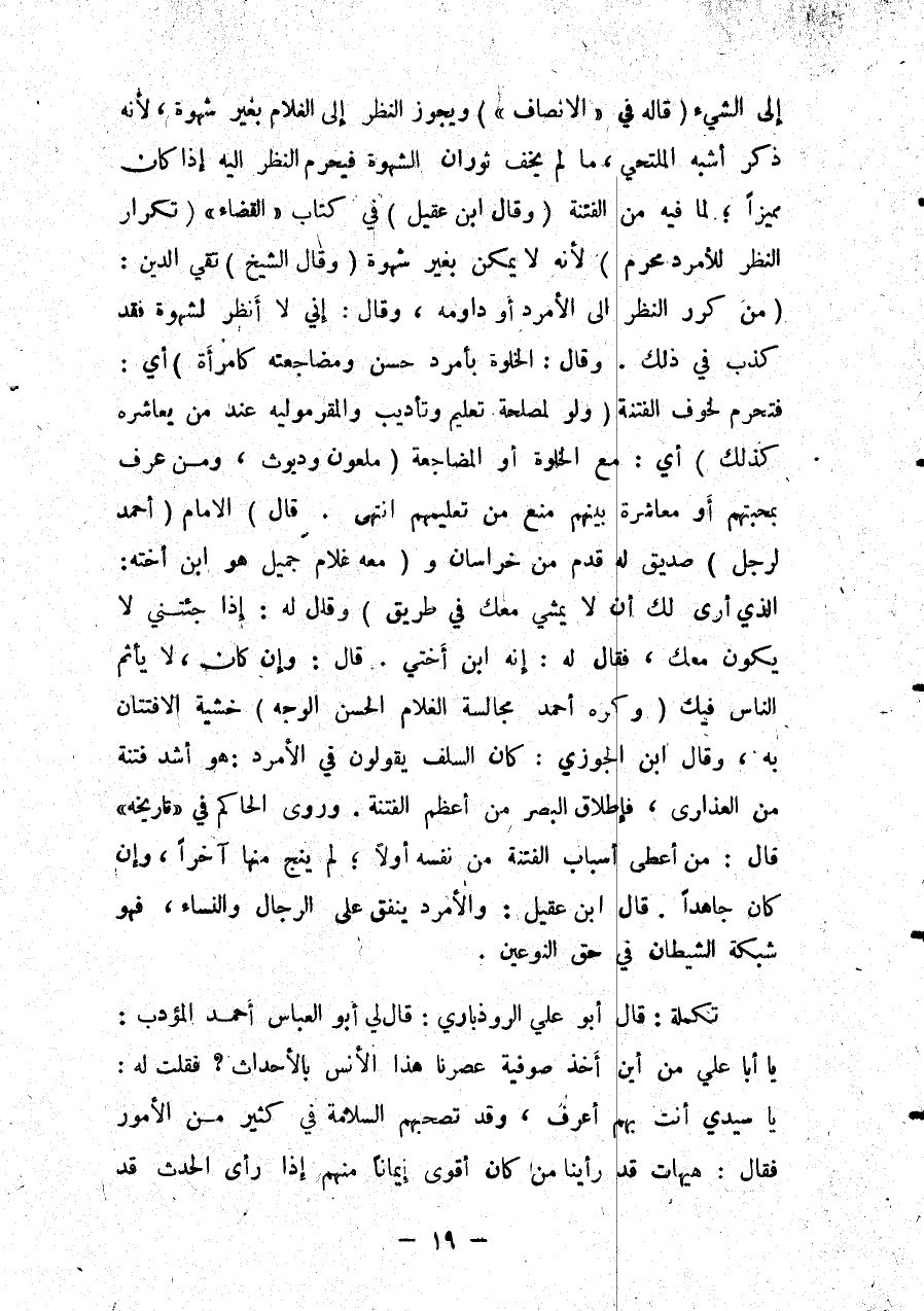 وَيَجُوزُ النَّظَرُ إلَى الْغُلَامِ بِغَيْرِ شَهْوَةٍ، لِأَنَّهُ ذَكَرٌ أَشْبَهَ الْمُلْتَحِي، مَا لَمْ يَخَفْ ثَوَرَانَ الشَّهْوَةِ، فَيَحْرُمُ النَّظَرُ إلَيْهِ إذَا كَانَ مُمَيِّزًا؛ لِمَا فِيهِ مِنْ الْفِتْنَةِ (وَقَالَ ابْنُ عَقِيلٍ) فِي كِتَابِ " الْقَضَاءِ " (تَكْرَارُ النَّظَرِ لِلْأَمْرَدِ مُحَرَّمٌ) لِأَنَّهُ لَا يُمْكِنُ بِغَيْرِ شَهْوَةٍ (وَقَالَ الشَّيْخُ) تَقِيُّ الدِّينِ: (مَنْ كَرَّرَ النَّظَرَ إلَى الْأَمْرَدِ أَوْ دَاوَمَهُ، وَقَالَ: إنِّي لَا أَنْظُرُ لِشَهْوَةٍ فَقَدْ كَذَبَ فِي ذَلِكَ وَقَالَ: الْخَلْوَةُ بِأَمْرَدَ حَسَنٌ وَمُضَاجَعَتُهُ كَامْرَأَةٍ)