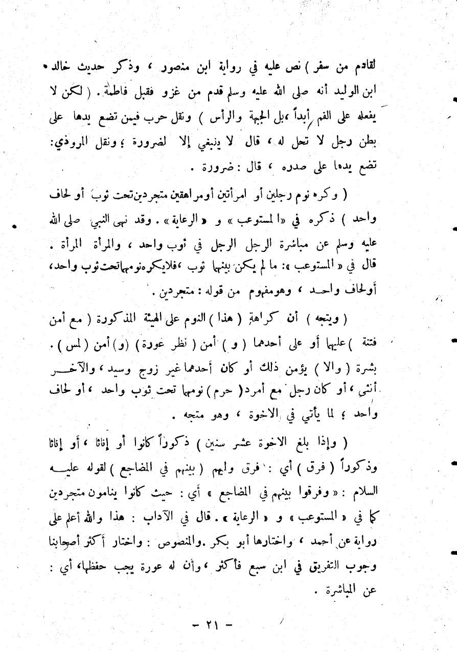 (وَكُرِهَ نَوْمُ رَجُلَيْنِ أَوْ امْرَأَتَيْنِ أَوْ مُرَاهِقَيْنِ مُتَجَرِّدَيْنِ تَحْتَ ثَوْبٍ أَوْ لِحَافٍ وَاحِدٍ) ذَكَرَهُ فِي " الْمُسْتَوْعِبِ " وَ " الرِّعَايَةِ ". وَقَدْ «نَهَى النَّبِيُّ - صَلَّى اللَّهُ عَلَيْهِ وَسَلَّمَ - عَنْ مُبَاشَرَةِ الرَّجُلِ الرَّجُلَ فِي ثَوْبٍ وَاحِدٍ، وَالْمَرْأَةِ الْمَرْأَةَ» . قَالَ فِي " الْمُسْتَوْعِبِ ": مَا لَمْ يَكُنْ بَيْنَهُمَا ثَوْبٌ، فَلَا يُكْرَهُ نَوْمُهَا تَحْتَ ثَوْبٍ وَاحِدٍ، أَوْ لِحَافٍ وَاحِدٍ، وَهُوَ مَفْهُومٌ مِنْ قَوْلِهِ: مُتَجَرِّدَيْنِ.