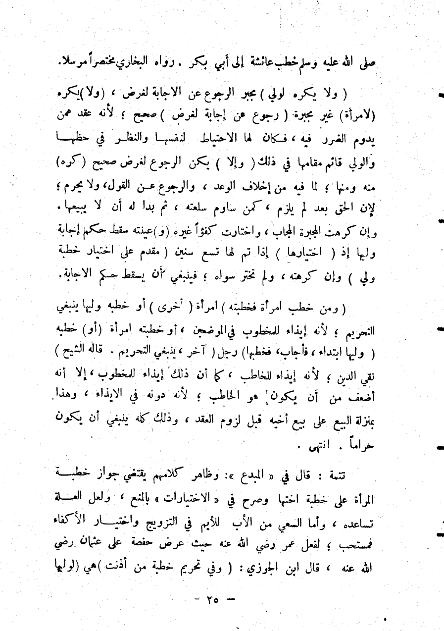 - صَلَّى اللَّهُ عَلَيْهِ وَسَلَّمَ - خَطَبَ عَائِشَةَ إلَى أَبِي بَكْرٍ» رَوَاهُ الْبُخَارِيُّ مُخْتَصَرًا مُرْسَلًا.