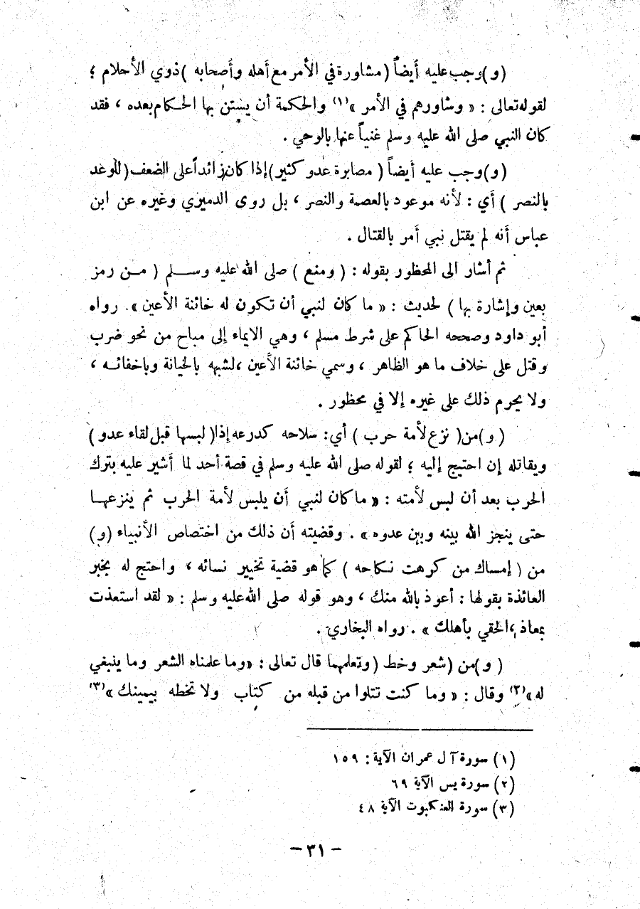 (وَ) وَجَبَ عَلَيْهِ أَيْضًا (مُشَاوَرَةٌ فِي الْأَمْرِ مَعَ أَهْلِهِ وَأَصْحَابِهِ) ذَوِي الْأَحْلَامِ؛ لِقَوْلِهِ تَعَالَى: «وَشَاوِرْهُمْ فِي الْأَمْرِ» وَالْحِكْمَةُ أَنْ يَسْتَنَّ بِهَا الْحُكَّامُ بَعْدَهُ، فَقَدْ كَانَ النَّبِيُّ - صَلَّى اللَّهُ عَلَيْهِ وَسَلَّمَ - غَنِيًّا عَنْهَا بِالْوَحْيِ.