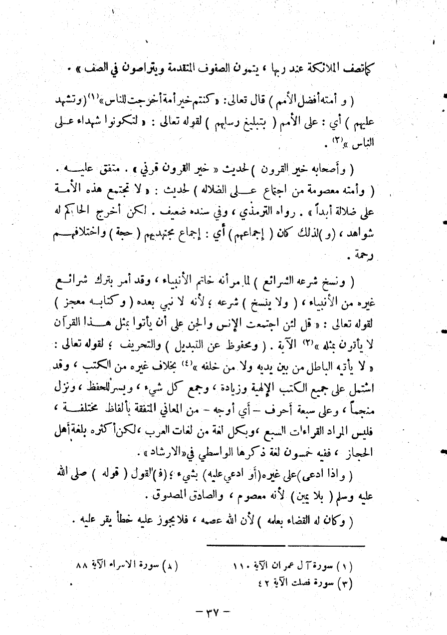 (وَأَصْحَابُهُ خَيْرُ الْقُرُونِ) لِحَدِيثِ «خَيْرُ الْقُرُونِ قَرْنِي» . مُتَّفَقٌ عَلَيْهِ. (وَأُمَّتُهُ مَعْصُومَةٌ مِنْ اجْتِمَاعٍ عَلَى الضَّلَالَةِ) لِحَدِيثِ: «لَا تَجْتَمِعُ هَذِهِ الْأُمَّةُ عَلَى ضَلَالَةٍ أَبَدًا» . رَوَاهُ التِّرْمِذِيُّ، وَفِي سَنَدِهِ ضَعِيفٌ. لَكِنْ أَخْرَجَ الْحَاكِمُ لَهُ شَوَاهِدَ، (وَ) لِذَلِكَ كَانَ (إجْمَاعُهُمْ) أَيْ: إجْمَاعُ مُجْتَهِدِيهِمْ (حُجَّةً) وَاخْتِلَافُهُمْ رَحْمَةً.