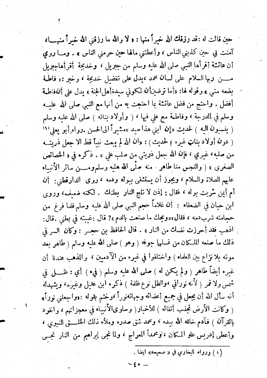 حِينَ قَالَتْ لَهُ: قَدْ رَزَقَك اللَّهُ خَيْرًا مِنْهَا: لَا وَاَللَّهِ مَا رَزَقَنِي اللَّهُ خَيْرًا مِنْهَا، آمَنَتْ بِي حِينَ كَذَّبَنِي النَّاسُ، وَأَعْطَتْنِي مَالَهَا حِينَ حَرَمَنِي النَّاسُ» . وَمَا رُوِيَ «أَنَّ عَائِشَةَ أَقْرَأَهَا النَّبِيُّ - صَلَّى اللَّهُ عَلَيْهِ وَسَلَّمَ - مِنْ جِبْرِيلَ، وَخَدِيجَةُ أَقْرَأَهَا جِبْرِيلُ مِنْ رَبِّهَا السَّلَامَ عَلَى لِسَانِ مُحَمَّدٍ» ، يَدُلُّ عَلَى تَفْضِيلِ خَدِيجَةَ، وَخَبَرِ: «فَاطِمَةُ بُضْعَةٌ مِنِّي» وَقَوْلُهُ لَهَا: «أَمَّا تَرْضِينَ أَنْ تَكُونِي سَيِّدَةَ أَهْلِ الْجَنَّةِ» يَدُلُّ عَلَى أَنَّ فَاطِمَةَ أَفْضَلُ. وَاحْتَجَّ مَنْ فَضَّلَ عَائِشَةَ بِمَا احْتَجَّتْ بِهِ مِنْ أَنَّهَا مَعَ النَّبِيِّ - صَلَّى اللَّهُ عَلَيْهِ وَسَلَّمَ - فِي الدَّرَجَةِ، وَفَاطِمَةُ مَعَ عَلِيٍّ فِيهَا، (وَأَوْلَادُ بَنَاتِهِ) - صَلَّى اللَّهُ عَلَيْهِ وَسَلَّمَ - (يُنْسَبُونَ إلَيْهِ) لِحَدِيثِ «إنَّ ابْنِي هَذَا سَيِّدٌ مُشِيرًا إلَى الْحَسَنِ» . رَوَاهُ أَبُو يَعْلَى (دُونَ أَوْلَادِ بَنَاتِ غَيْرِهِ؛ لِحَدِيثِ) : «إنَّ اللَّهَ لَمْ يَبْعَثْ نَبِيًّا قَطُّ إلَّا جَعَلَ ذُرِّيَّتَهُ مِنْ صُلْبِهِ، غَيْرِي، فَإِنَّ اللَّهَ جَعَلَ ذُرِّيَّتِي مِنْ صُلْبِ عَلِيٍّ» ذَكَرَهُ فِي " الْخَصَائِصِ الصُّغْرَى "