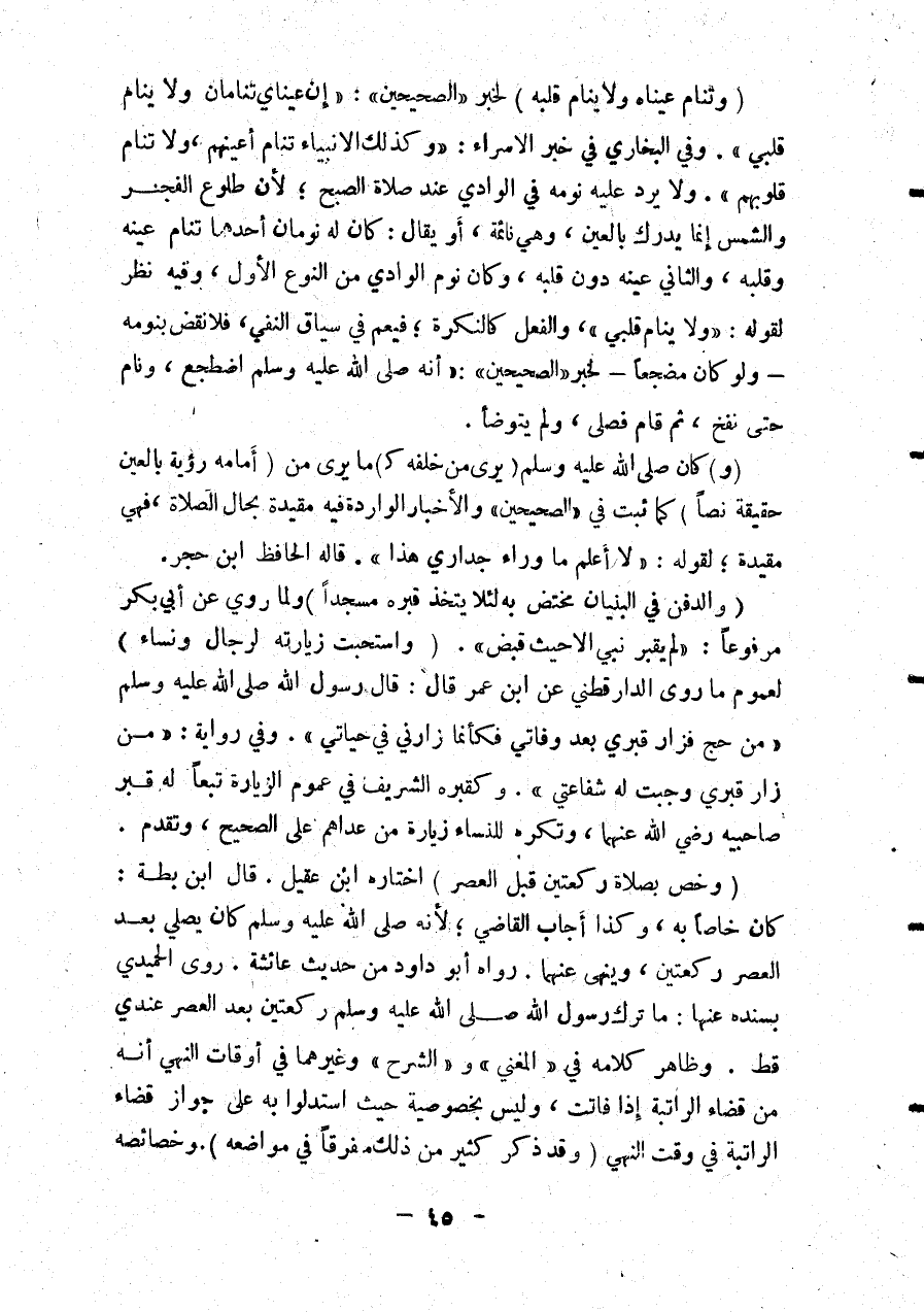 (وَتَنَامُ عَيْنَاهُ وَلَا يَنَامُ قَلْبُهُ) لِخَبَرِ " الصَّحِيحَيْنِ ": «إنَّ عَيْنَايَ تَنَامَانِ وَلَا يَنَامُ قَلْبِي» . وَفِي الْبُخَارِيِّ فِي خَبَرِ الْإِسْرَاءِ: «وَكَذَلِكَ الْأَنْبِيَاءُ تَنَامُ أَعْيُنُهُمْ، وَلَا تَنَامُ قُلُوبُهُمْ» . وَلَا يُرَدُّ عَلَيْهِ نَوْمُهُ فِي الْوَادِي عِنْدَ صَلَاةِ الصُّبْحِ؛ لِأَنَّ طُلُوعَ الْفَجْرِ وَالشَّمْسِ إنَّمَا يُدْرَكُ بِالْعَيْنِ، وَهِيَ نَائِمَةٌ، أَوْ يُقَالُ: كَانَ لَهُ نُوَمَانِ أَحَدُهُمَا تَنَامُ عَيْنُهُ وَقَلْبُهُ، وَالثَّانِي عَيْنُهُ دُونَ قَلْبِهِ، وَكَانَ نَوْمُ الْوَادِي مِنْ النَّوْعِ الْأَوَّلِ، وَفِيهِ نَظَرٌ لِقَوْلِهِ: «وَلَا يَنَامُ قَلْبِي» ، وَالْفِعْلُ كَالنَّكِرَةِ؛ فَيَعُمُّ فِي سِيَاقِ النَّفْيِ، فَلَا نَقْضَ بِنَوْمِهِ وَلَوْ كَانَ مَضْجَعًا لِخَبَرِ الصَّحِيحَيْنِ: «أَنَّهُ - صَلَّى اللَّهُ عَلَيْهِ وَسَلَّمَ - اضْطَجَعَ، وَنَامَ حَتَّى نَفَخَ، ثُمَّ قَامَ فَصَلَّى، وَلَمْ يَتَوَضَّأْ» (وَ) كَانَ - صَلَّى اللَّهُ عَلَيْهِ وَسَلَّمَ - (يَرَى مِنْ خَلْفِهِ كَ) مَا يَرَى مِنْ (أَمَامِهِ رُؤْيَةً بِالْعَيْنِ حَقِيقَةً نَصًّا) كَمَا ثَبَتَ فِي " الصَّحِيحَيْنِ " وَالْأَخْبَارُ الْوَارِدَةُ فِيهِ مُقَيَّدَةٌ بِحَالِ الصَّلَاةِ، فَهِيَ مُقَيَّدَةٌ؛ لِقَوْلِهِ: «لَا أَعْلَمُ مَا وَرَاءَ جِدَارِي هَذَا» .