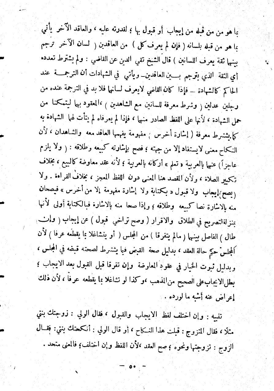 بِمَا هُوَ مِنْ قِبَلِهِ مِنْ إيجَابٍ أَوْ قَبُولٍ بِهَا؛ لِقُدْرَتِهِ عَلَيْهِ، وَالْعَاقِدُ الْآخَرُ يَأْتِي بِمَا هُوَ مِنْ قِبَلِهِ بِلِسَانِهِ (فَإِنْ لَمْ يَعْرِفْ كُلٌّ) مِنْ الْعَاقِدَيْنِ (لِسَانَ الْآخَرِ تَرْجَمَ بَيْنَهُمَا ثِقَةٌ يَعْرِفُ اللِّسَانَيْنِ) قَالَ الشَّيْخُ تَقِيُّ الدِّينِ عَنْ الْقَاضِي: وَلَمْ يُشْتَرَطْ تَعَدُّدُهُ أَيْ الثِّقَةِ الَّذِي يُتَرْجِمُ بَيْنَ الْعَاقِدَيْنِ - وَيَأْتِي فِي الشَّهَادَاتِ أَنَّ التَّرْجَمَةَ عِنْدَ الْحَاكِمِ كَالشَّهَادَةِ - فَإِذَا كَانَ الْقَاضِي لَا يَعْرِفُ لِسَانَهُمَا فَلَا بُدَّ فِي التَّرْجَمَةِ عِنْدَهُ مِنْ رَجُلَيْنِ عَدْلَيْنِ (وَشَرْطُ مَعْرِفَةٍ لِلِّسَانَيْنِ مَعَ الشَّاهِدَيْنِ) ، الْمَعْقُودِ بِهِمَا لِيَتَمَكَّنَا مِنْ حَمْلِ الشَّهَادَةِ؛ لِأَنَّهَا عَلَى اللَّفْظِ الصَّادِرِ مِنْهُمَا، فَإِذَا لَمْ يَعْرِفَاهُ لَمْ يَتَأَتَّ لَهُمَا الشَّهَادَةُ بِهِ كَمَا يُشْتَرَطُ مَعْرِفَةُ (إشَارَةِ أَخْرَسَ) مَفْهُومَةٍ يَفْهَمُهَا الْعَاقِدُ مَعَهُ وَالشَّاهِدَانِ، لِأَنَّ النِّكَاحَ مَعْنَى لَا يُسْتَفَادُ إلَّا مِنْ جِهَتِهِ؛ فَصَحَّ بِإِشَارَتِهِ كَبَيْعِهِ وَطَلَاقِهِ: (وَلَا يَلْزَمُ عَاجِزًا) عَنْهُمَا بِالْعَرَبِيَّةِ " تَعَلُّمُ " أَرْكَانِهِ بِالْعَرَبِيَّةِ؛ لِأَنَّهُ عَقْدُ مُعَاوَضَةٍ كَالْبَيْعِ، بِخِلَافِ تَكْبِيرِ الصَّلَاةِ، وَلِأَنَّ الْمَقْصِدَ هُنَا الْمَعْنَى دُونَ اللَّفْظِ الْمُعْجِزِ، بِخِلَافِ الْقِرَاءَةِ.