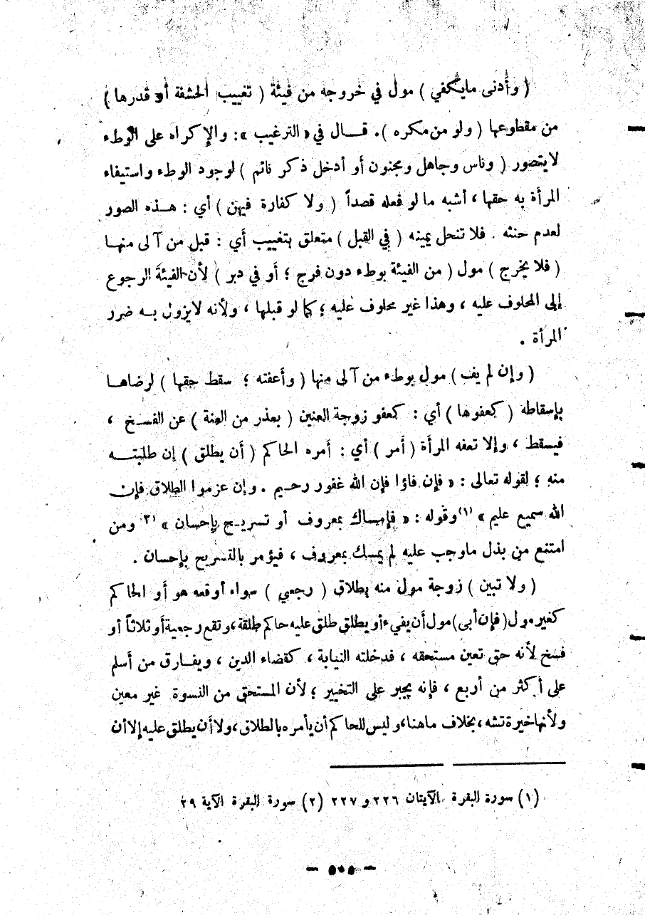 (وَأَدْنَى مَا يَكْفِي) مُولٍ فِي خُرُوجِهِ مِنْ فِيئَةٍ (تَغْيِيبُ الْحَشَفَةِ أَوْ قَدْرِهَا) مِنْ مَقْطُوعِهَا (وَلَوْ مِنْ مُكْرَهٍ) قَالَ فِي " التَّرْغِيبِ ": وَالْإِكْرَاهُ عَلَى الْوَطْءِ لَا يُتَصَوَّرُ (وَنَاسٍ وَجَاهِلٍ وَمَجْنُونٍ أَوْ أُدْخِلَ ذَكَرُ نَائِمٍ) لِوُجُودِ الْوَطْءِ وَاسْتِيفَاءِ الْمَرْأَةِ بِهِ حَقَّهَا، أَشْبَهَ مَا لَوْ فَعَلَهُ قَصْدًا (وَلَا كَفَّارَةَ فِيهِنَّ) أَيْ: هَذِهِ الصُّوَرُ لِعَدَمِ حِنْثِهِ فَلَا تَنْحَلُّ يَمِينُهُ (فِي الْقُبُلِ) مُتَعَلِّقٌ بِتَغْيِيبٍ أَيْ: قُبُلِ مَنْ آلَى مِنْهَا (فَلَا يَخْرُجُ) مُولٍ (مِنْ الْفِيئَةِ بِوَطْءٍ دُونَ فَرْجٍ؛ أَوْ فِي دُبُرٍ) لِأَنَّ الْفِيئَةَ الرُّجُوعُ إلَى الْمَحْلُوفِ عَلَيْهِ، وَهَذَا غَيْرُ مَحْلُوفٍ عَلَيْهِ؛ كَمَا لَوْ قَبَّلَهَا، وَلِأَنَّهُ لَا يَزُولُ بِهِ ضَرَرُ الْمَرْأَةِ.
