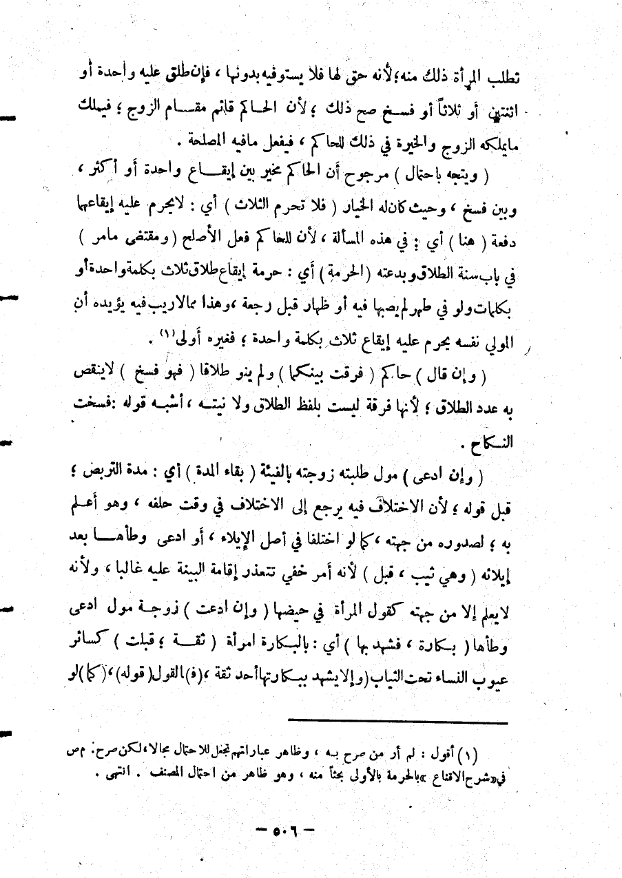تَطْلُبَ الْمَرْأَةُ ذَلِكَ مِنْهُ؛ لِأَنَّهُ حَقٌّ فَلَا يَسْتَوْفِيهِ بِدُونِهَا، فَإِنْ طَلَّقَ عَلَيْهِ وَاحِدَةً أَوْ اثْنَتَيْنِ أَوْ ثَلَاثًا أَوْ فَسَخَ صَحَّ ذَلِكَ؛ لِأَنَّ الْحَاكِمَ قَائِمًا مَقَامَ الزَّوْجِ؛ فَيَمْلِكُ مَا يَمْلِكُهُ الزَّوْجُ وَالْخِيرَةُ فِي ذَلِكَ لِلْحَاكِمِ، فَيَفْعَلُ مَا فِيهِ الْمَصْلَحَةُ (وَيَتَّجِهُ بِاحْتِمَالٍ) مَرْجُوحٍ أَنَّ الْحَاكِمَ مُخَيَّرٌ بَيْنَ إيقَاعِ وَاحِدَةٍ أَوْ أَكْثَرَ، وَبَيْنَ فَسْخٍ، وَحَيْثُ كَانَ لَهُ الْخِيَارُ (فَلَا تَحْرُمُ الثَّلَاثُ) أَيْ: لَا يَحْرُمُ عَلَيْهِ إيقَاعُهُمَا دَفْعَةً (هُنَا) أَيْ: فِي هَذِهِ الْمَسْأَلَةِ، لِأَنَّ لِلْحَاكِمِ فِعْلَ الْأَصْلَحِ (وَمُقْتَضَى مَا مَرَّ) فِي بَابِ سُنَّةِ الطَّلَاقِ وَبِدْعَتِهِ (الْحُرْمَةُ) أَيْ: حُرْمَةُ إيقَاعِ طَلَاقِ ثَلَاثٍ بِكَلِمَةٍ وَاحِدَةٍ أَوْ بِكَلِمَاتٍ وَلَوْ فِي طُهْرٍ لَمْ يُصِبْهَا فِيهِ أَوْ ظِهَارٍ قَبْلَ رَجْعَةٍ، وَهَذَا مِمَّا لَا رَيْبَ فِيهِ يُؤَيِّدُهُ أَنَّ الْمُولِيَ نَفْسَهُ يَحْرُمُ عَلَيْهِ إيقَاعُ ثَلَاثٍ بِكَلِمَةٍ وَاحِدَةٍ؛ فَغَيْرُهُ أَوْلَى.