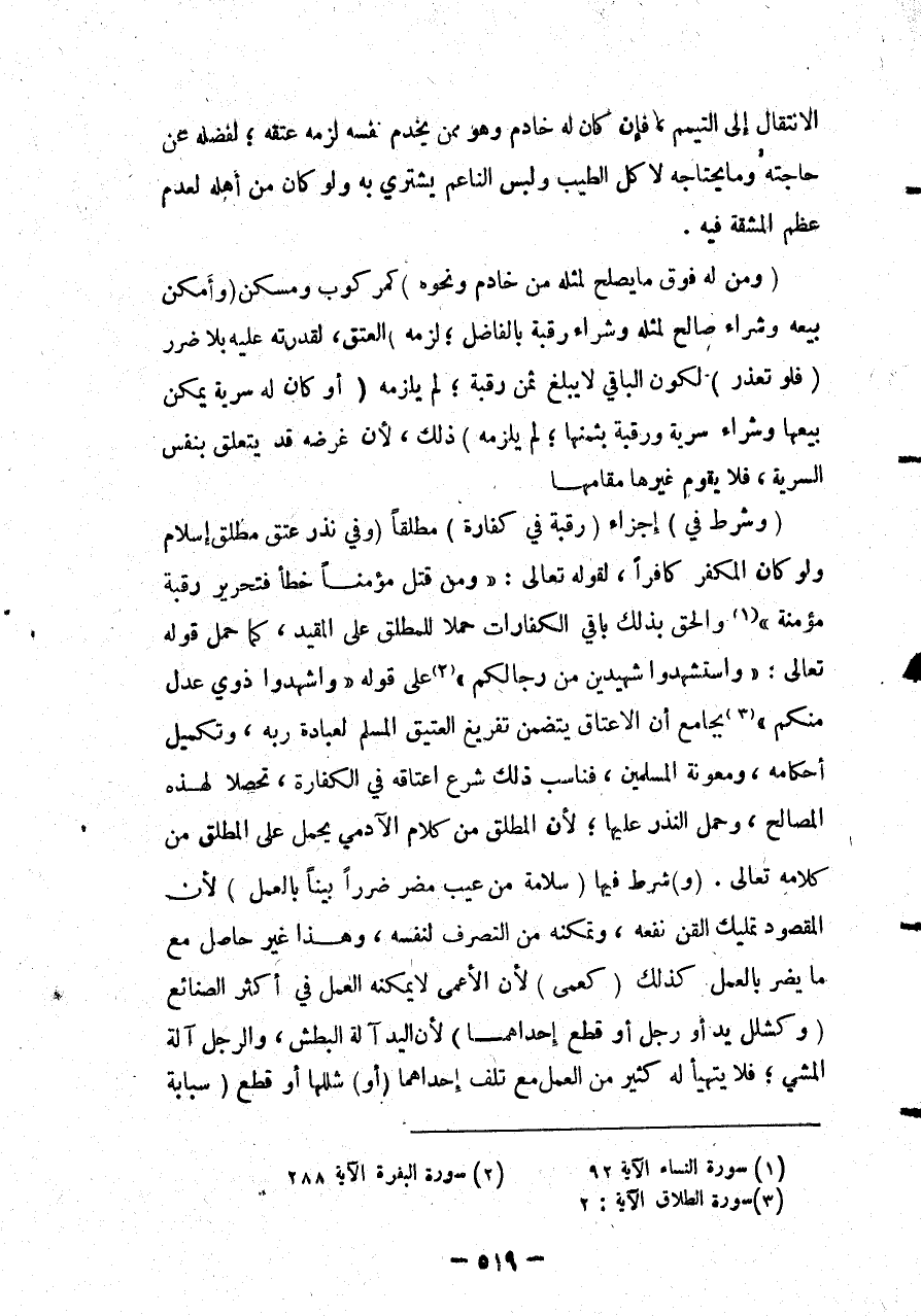 (وَشُرِطَ فِي) إجْزَاءِ (رَقَبَةٍ فِي كَفَّارَةٍ) مُطْلَقًا (وَفِي نَذْرِ عِتْقٍ مُطْلَقٍ إسْلَامٌ) وَلَوْ كَانَ الْمُكَفِّرُ كَافِرًا قَوْله تَعَالَى: {وَمَنْ قَتَلَ مُؤْمِنًا خَطَأً فَتَحْرِيرُ رَقَبَةٍ مُؤْمِنَةٍ} [النساء: 92] وَأُلْحِقَ بِذَلِكَ بَاقِي الْكَفَّارَاتِ حَمْلًا لِلْمُطْلَقِ عَلَى الْمُقَيَّدِ، كَمَا حُمِلَ قَوْله تَعَالَى {وَاسْتَشْهِدُوا شَهِيدَيْنِ مِنْ رِجَالِكُمْ} [البقرة: 282] عَلَى قَوْلِهِ {وَأَشْهِدُوا ذَوَيْ عَدْلٍ مِنْكُمْ} [الطلاق: 2] بِجَامِعِ أَنَّ الْإِعْتَاقَ يَتَضَمَّنُ تَفْرِيغَ الْعَتِيقِ الْمُسْلِمِ لِعِبَادَةِ رَبِّهِ، وَتَكْمِيلِ أَحْكَامِهِ، وَمَعُونَةِ الْمُسْلِمِينَ، فَنَاسَبَ ذَلِكَ شَرْعُ إعْتَاقِهِ فِي الْكَفَّارَةِ، تَحَصُّلًا لِهَذِهِ الْمَصَالِحِ، وَحُمِلَ النَّذْرُ عَلَيْهَا؛ لِأَنَّ الْمُطْلَقَ مِنْ كَلَامِ الْآدَمِيِّ يُحْمَلُ عَلَى الْمُطْلَقِ مِنْ كَلَامِهِ تَعَالَى (وَ) شُرِطَ فِيهَا (سَلَامَةٌ مِنْ عَيْبٍ مُضِرٍّ ضَرَرًا بَيِّنًا بِالْعَمَلِ) لِأَنَّ الْمَقْصُودَ تَمْلِيكُ الْقِنِّ نَفْعَهُ، وَتَمَكُّنُهُ مِنْ التَّصَرُّفِ لِنَفْسِهِ، وَهَذَا غَيْرُ حَاصِلٍ مَعَ مَا يَضُرُّ بِالْعَمَلِ كَذَلِكَ (كَعَمًى) لِأَنَّ الْأَعْمَى لَا يُمْكِنُهُ الْعَمَلُ فِي أَكْثَرِ الصَّنَائِعِ (وَكَشَلَلِ يَدٍ أَوْ رِجْلٍ أَوْ قَطْعِ إحْدَاهُمَا) لِأَنَّ الْيَدَ آلَةُ الْبَطْشِ، وَالرِّجْلَ آلَةُ الْمَشْيِ؛ فَلَا يَتَهَيَّأُ لَهُ كَثِيرٌ مِنْ الْعَمَلِ مَعَ تَلَفِ إحْدَاهُمَا (أَوْ) شَلَلِهَا أَوْ قَطْعِ (سَبَّابَةٍ