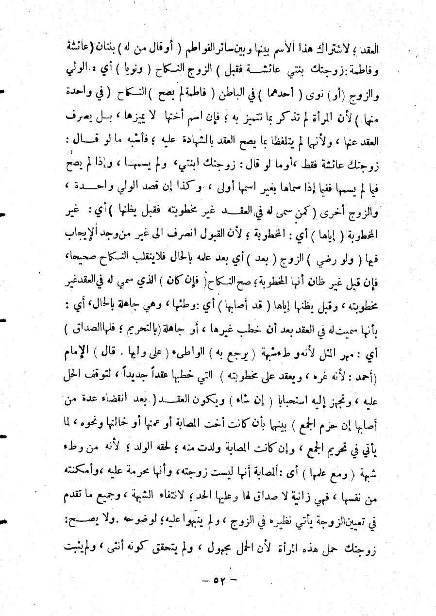 الْعَقْدُ؛ لِاشْتِرَاكِ هَذَا الِاسْمِ بَيْنَهَا وَبَيْنَ سَائِرِ الْفَوَاطِمِ. (أَوْ قَالَ مَنْ لَهُ) بِنْتَانِ (عَائِشَةُ وَفَاطِمَةُ: زَوَّجْتُك بِنْتِي عَائِشَةَ فَقَبِلَ) الزَّوْجُ النِّكَاحَ (وَنَوَيَا) أَيْ: الْوَلِيُّ وَالزَّوْجُ (أَوْ) نَوَى (أَحَدُهُمَا) فِي الْبَاطِنِ (فَاطِمَةَ لَمْ يَصِحَّ) النِّكَاحُ (فِي وَاحِدَةٍ مِنْهُمَا) ؛ لِأَنَّ الْمَرْأَةَ لَمْ تُذْكَرْ بِمَا تَتَمَيَّزُ بِهِ؛ فَإِنَّ اسْمَ أُخْتِهَا لَا يُمَيِّزُهَا، بَلْ يَصْرِفُ الْعَقْدَ عَنْهَا، وَلِأَنَّهُمَا لَمْ يَتَلَفَّظَا بِمَا يَصِحُّ الْعَقْدُ بِالشَّهَادَةِ عَلَيْهِ؛ فَأَشْبَهَ مَا لَوْ قَالَ: زَوَّجْتُك عَائِشَةَ فَقَطْ، أَوْ مَا لَوْ قَالَ: زَوَّجْتُك ابْنَتِي، وَلَمْ يُسَمِّهَا، وَإِذَا لَمْ يَصِحَّ فِيمَا لَمْ يُسَمِّهَا فَفِيمَا إذَا سَمَّاهَا بِغَيْرِ اسْمِهَا أَوْلَى، وَكَذَا إنْ قَصَدَ الْوَلِيُّ وَاحِدَةً، وَالزَّوْجُ أُخْرَى (كَمَنْ سُمِّيَ لَهُ فِي الْعَقْدِ غَيْرُ مَخْطُوبَتِهِ فَقَبِلَ يَظُنُّهَا) أَيْ: غَيْرَ الْمَخْطُوبَةِ (إيَّاهَا) أَيْ: الْمَخْطُوبَةَ؛ لِأَنَّ الْقَبُولَ انْصَرَفَ إلَى غَيْرِ مَنْ وُجِدَ الْإِيجَابُ فِيهَا (وَلَوْ رَضِيَ) الزَّوْجُ (بَعْدُ) أَيْ بَعْدَ عِلْمِهِ بِالْحَالِ فَلَا يَنْقَلِبُ النِّكَاحُ صَحِيحًا، فَإِنْ قَبِلَ غَيْرَ ظَانٍّ أَنَّهَا الْمَخْطُوبَةُ؛ صَحَّ النِّكَاحُ (فَإِنْ كَانَ) الَّذِي سُمِّيَ لَهُ فِي الْعَقْدِ غَيْرُ مَخْطُوبَتِهِ، وَقَبِلَ يَظُنُّهَا إيَّاهَا (قَدْ أَصَابَهَا) أَيْ: وَطِئَهَا، وَهِيَ جَاهِلَةٌ بِالْحَالِ، أَيْ: بِأَنَّهَا سُمِّيَتْ لَهُ فِي الْعَقْدِ بَعْدَ أَنْ خَطَبَ غَيْرَهَا، أَوْ جَاهِلَةٌ (بِالتَّحْرِيمِ؛ فَلَهَا الصَّدَاقُ) أَيْ: مَهْرُ الْمِثْلِ؛ لِأَنَّهُ وَطْءُ شُبْهَةٍ (يَرْجِعُ بِهِ) الْوَاطِئُ (عَلَى وَلِيِّهَا. قَالَ) الْإِمَامُ (أَحْمَدُ: لِأَنَّهُ غَرَّهُ، وَيَعْقِدُ عَلَى مَخْطُوبَتِهِ) الَّتِي خَطَبَهَا عَقْدًا جَدِيدًا، لِتَوَقُّفِ الْحِلِّ عَلَيْهِ، وَتُجَهَّزُ إلَيْهِ اسْتِحْبَابًا (إنْ شَاءَ) وَيَكُونُ الْعَقْدُ (بَعْدَ انْقِضَاءِ عِدَّةِ مَنْ أَصَابَهَا إنْ حَرُمَ الْجَمْعُ) بَيْنَهُمَا بِأَنْ كَانَتْ أُخْتَ الْمُصَابَةِ أَوْ عَمَّتَهَا أَوْ خَالَتَهَا وَنَحْوِهِ، لِمَا يَأْتِي فِي تَحْرِيمِ الْجَمْعِ، وَإِنْ كَانَتْ الْمُصَابَةُ وَلَدَتْ مِنْهُ؛ لَحِقَهُ الْوَلَدُ؛ لِأَنَّهُ مِنْ وَطْءِ شُبْهَةٍ (وَمَعَ عِلْمِهَا) أَيْ: الْمُصَابَةِ أَنَّهَا لَيْسَتْ زَوْجَتُهُ، وَأَنَّهَا مُحَرَّمَةٌ عَلَيْهِ، وَأَمْكَنَتْهُ مِنْ نَفْسِهَا، فَهِيَ زَانِيَةٌ لَا صَدَاقَ لَهَا وَعَلَيْهَا الْحَدُّ؛ لِانْتِفَاءِ الشُّبْهَةِ، وَجَمِيعُ مَا تَقَدَّمَ فِي تَعْيِينِ الزَّوْجَةِ يَأْتِي نَظِيرُهُ فِي الزَّوْجِ، وَلَمْ يُنَبِّهُوا عَلَيْهِ؛ لِوُضُوحِهِ. وَلَا يَصِحُّ: زَوَّجْتُك حَمْلَ هَذِهِ الْمَرْأَةِ؛ لِأَنَّ الْحَمْلَ مَجْهُولٌ، وَلَمْ يَتَحَقَّقْ كَوْنُهُ أُنْثَى، وَلَمْ يَثْبُتْ