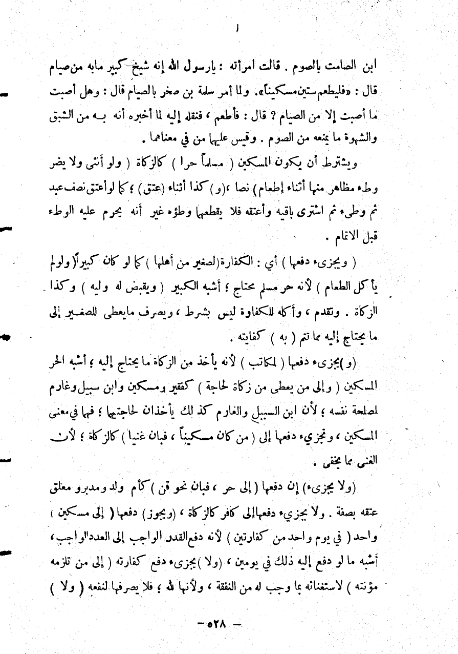 بِالصَّوْمِ قَالَتْ امْرَأَتُهُ: يَا رَسُولَ اللَّهِ إنَّهُ شَيْخٌ كَبِيرٌ مَا بِهِ مِنْ صِيَامٍ قَالَ: فَلْيُطْعِمْ سِتِّينَ مِسْكِينًا» «وَلَمَّا أَمَرَ سَلَمَةَ بْنَ صَخْرٍ بِالصِّيَامِ قَالَ: وَهَلْ أَصَبْت مَا أَصَبْت إلَّا مِنْ الصِّيَامِ؟ قَالَ: فَأَطْعِمْ» ، فَنَقَلَهُ إلَيْهِ لَمَّا أَخْبَرَهُ أَنَّهُ بِهِ مِنْ الشَّبَقِ وَالشَّهْوَةِ مَا يَمْنَعُهُ مِنْ الصَّوْمِ. وَقِيسَ عَلَيْهِمَا مَنْ فِي مَعْنَاهُمَا. وَيُشْتَرَطُ أَنْ يَكُونَ الْمِسْكِينُ (مُسْلِمًا حُرًّا) كَالزَّكَاةِ (وَلَوْ أُنْثَى وَلَا يَضُرُّ وَطْءُ مُظَاهَرٍ مِنْهَا أَثْنَاءَ إطْعَامٍ) نَصًّا، (وَ) كَذَا أَثْنَاءَ (عِتْقٍ) ؛ كَمَا لَوْ أَعْتَقَ نِصْفَ عَبْدٍ ثُمَّ وَطِئَ ثُمَّ اشْتَرَى بَاقِيَهُ وَأَعْتَقَهُ فَلَا يَقْطَعُهُمَا وَطْؤُهُ غَيْرَ أَنَّهُ يَحْرُمُ عَلَيْهِ الْوَطْءُ قَبْلَ الْإِتْمَامِ.